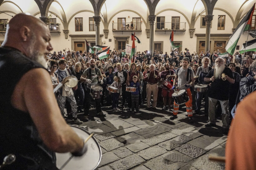 Un “equipaggio di terra” che ha poi sfilato per le vie del centro al grido di ” Firenze sa dove stare, Palestina libera dal fiume al mare” scandito dal ritmo travolgente dei tamburi del Collettivo di Fabbrica ex GKN.