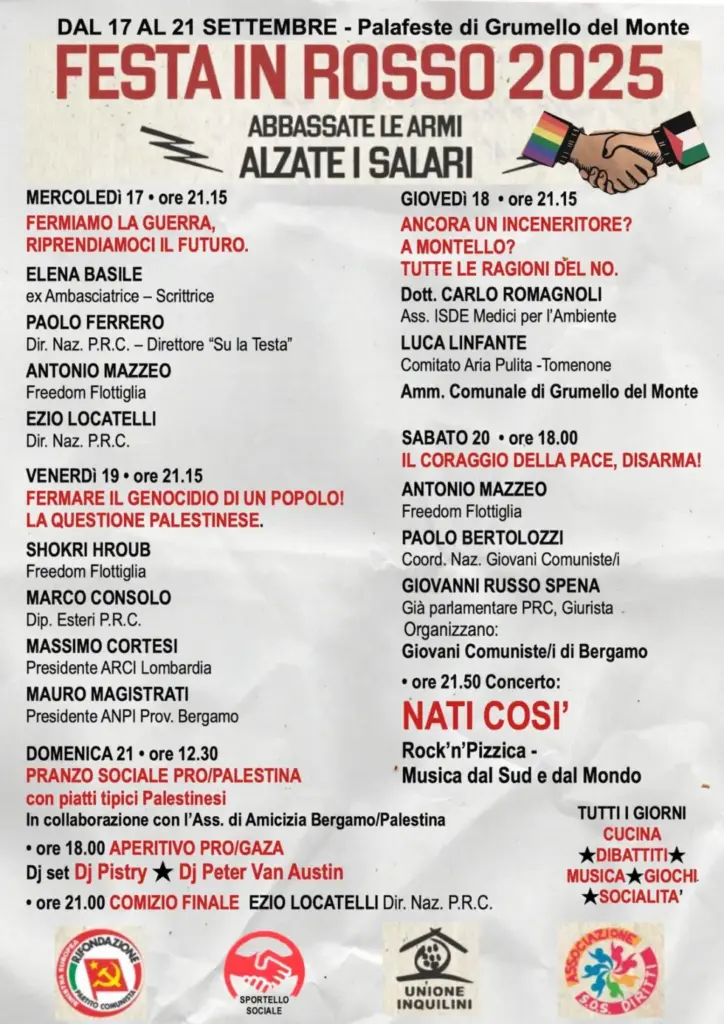 Il Palafeste di Grumello del Monte ospiterà per la prima volta, dal 17 al 21 settembre, la Festa in Rosso, organizzata dallo Sportello Sociale Val Calepio e da Rifondazione Comunista ValCalepio.