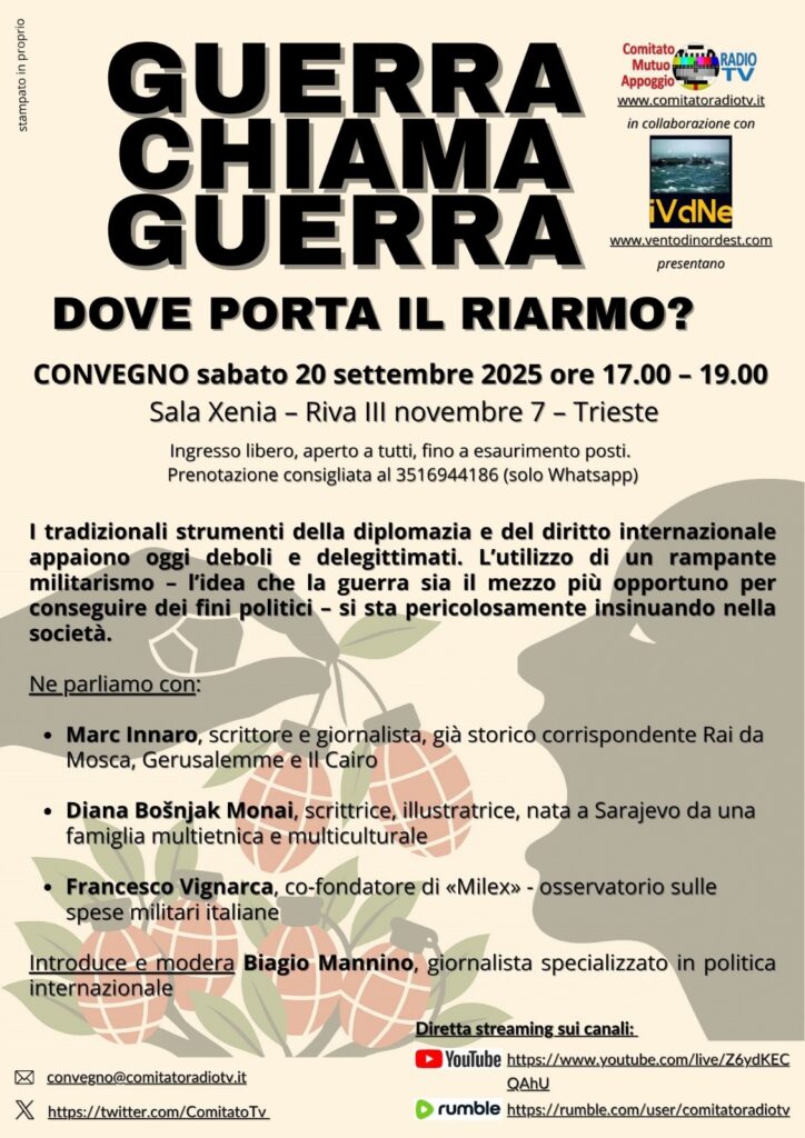 Sabato 20 settembre dalle ore 17 alle ore 19 presso la Sala Xenia di Riva III Novembre a Trieste si terrà il convegno “Guerra chiama guerra”