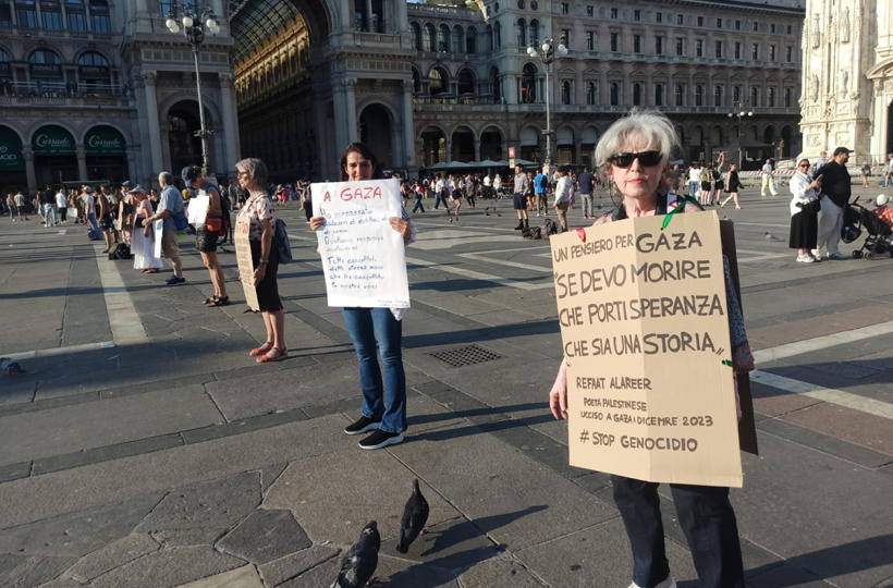 Siamo cresciuti, ma dobbiamo crescere ancora: abbiamo iniziato in una dozzina, oramai siamo regolarmente più di 100, di tutte le età e di tutte le origini. Alle 18.20 la prima fila è quasi fatta, dopo poco se ne aggiungono dietro due, a volte tre, fino a quattro. A tre metri di distanza, composti, in silenzio. Ci siamo detti che è bene spegnere i cellulari, lo si fa a teatro, non si puo’ farlo per Gaza? Non è facile il silenzio. È più facile gridare. Ma il silenzio ha una forza che inquieta, disturba, colpisce.