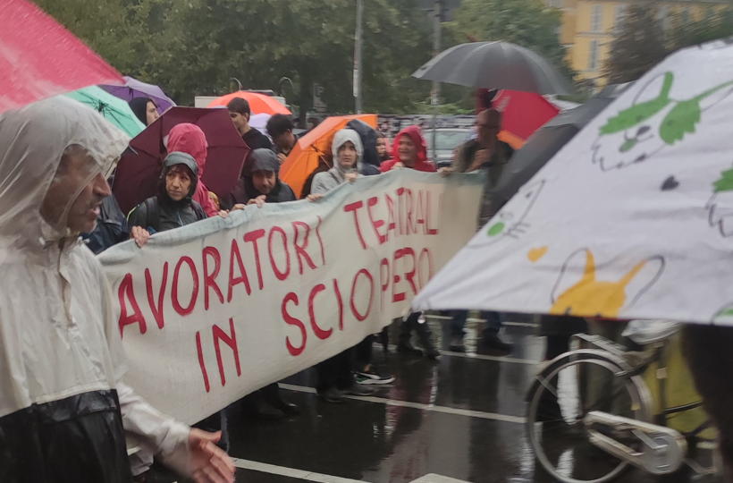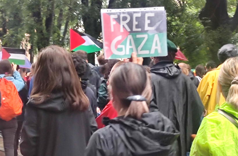 Si sente che c’era bisogno di uno sciopero, non bastava manifestare solo al sabato, bisognava interrompere la routine, il sistema che continua come se nulla fosse. I giovani palestinesi e con loro un mare di giovani e meno giovani non ce la fanno più a sostenere l’enorme frustrazione nell’assistere – da quasi due anni – ad immagini sempre più insopportabili. Moltissime anche le scuole, di ogni ordine e grado. Gli striscioni si vedono poco, tanto si è mescolati e fitti. La pioggia va e viene. Fradici, ma si va avanti fino alla fine: sono quasi le due quando si arriva tutti nel piazzale della Stazione Centrale.