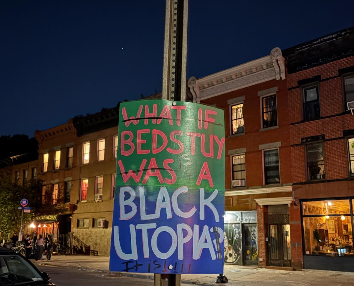 Domenica 21 settembre 2025: l’appuntamento è a mezzogiorno a Fulton Park, uno dei parchetti di Bedford-Stuyvesant a Brooklyn, il quartiere dove anche quest’anno mio marito ed io abbiamo preso dimora. In verità quasi nessuno chiama quest’area con il suo nome tutto intero, è per tutti Bed-Stuy; al tempo delle grandi battaglie per i diritti civili del secolo sorso il sobborgo si distinse come uno dei cuori ruggenti delle Pantere Nere. Camminando per le sue vie, se non si è troppo distratti, se ne può percepire ancora la presenza, come ben suggerisce il cartello che ho fotografato.