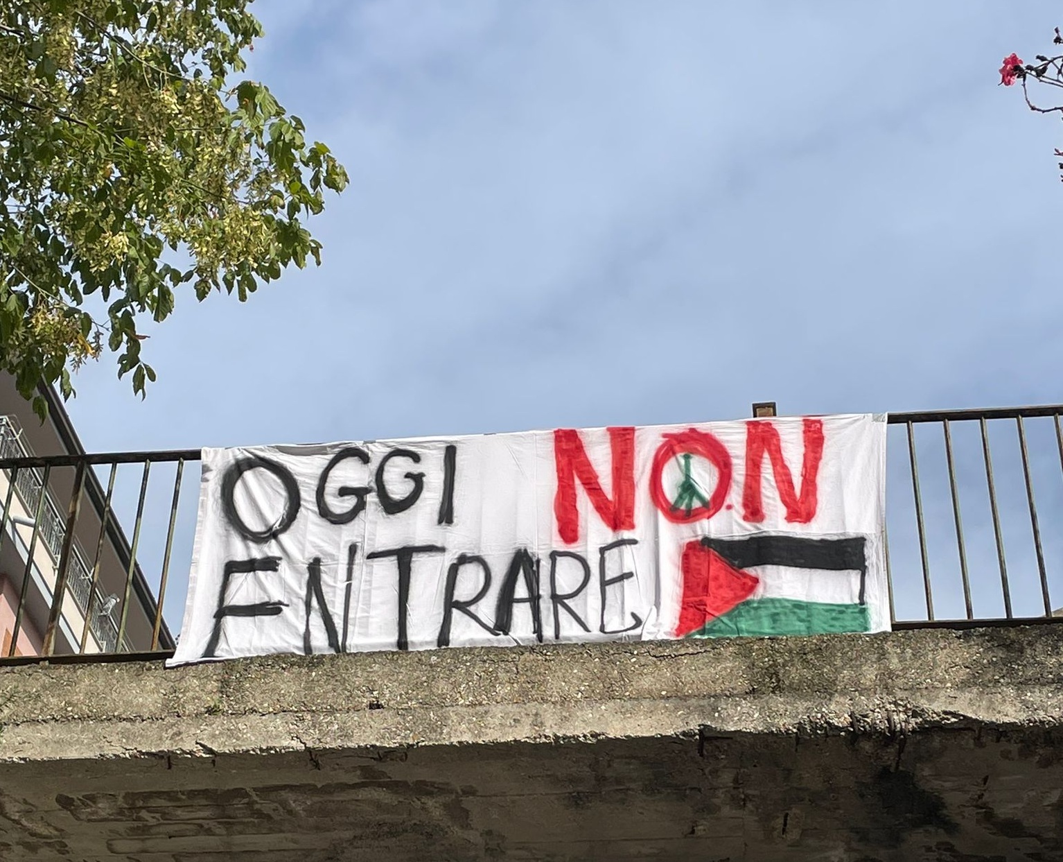 Davanti al cancello del Liceo Rinaldini di Ancona si sono radunati più di 400 studenti e studentesse, provenienti da tutte le scuole della città, accolti da due striscioni con la scritta “Oggi non entrare” accanto alla bandiera palestinese.