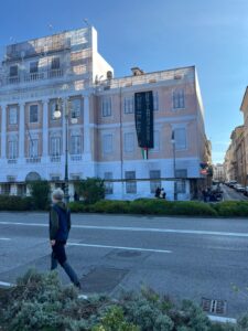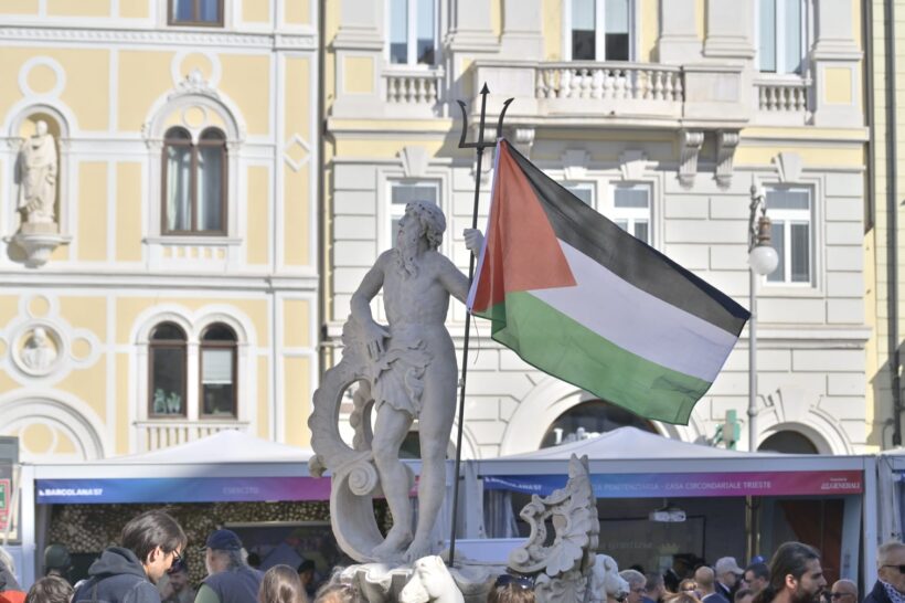 Sulla facciata di Palazzo Carciotti è comparsa uno striscione “Free Palestine – Sabotiamo la guerra” assieme ad una bandiera palestinese mentre un’altra bandiera enorme della Palestina è stata issata sulle falesie della Napoleonica.