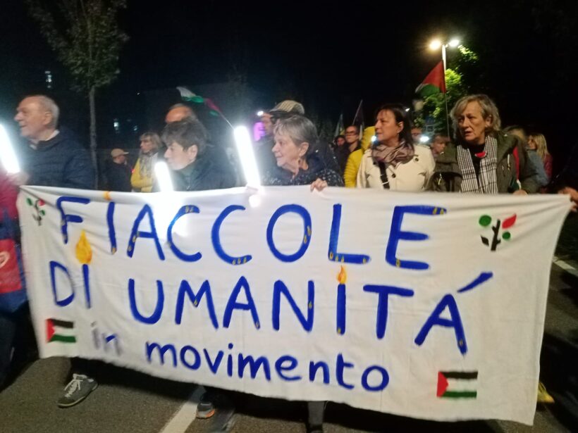 Giunto davanti all’Ospedale Civile il corteo si è ammutolito, le mille luci si sono concentrate sulla Palestina. Sono stati scanditi nel silenzio assoluto i nomi di operatori e operatrici sanitari di Gaza, uccisi dopo il 7 ottobre mentre soccorrevano e curavano, mentre difendevano il diritto di ogni essere umano di essere assistito. Sono stati ricordati anche i 361 sanitari detenuti senza processo. Un coro di nomi, una staffetta con altri duecentotrenta ospedali sparsi in tutta Italia, culminato con un prolungato applauso per rendere loro omaggio, denunciare il genocidio e dichiarare l’impegno di ciascuno per una pace giusta in Palestina.