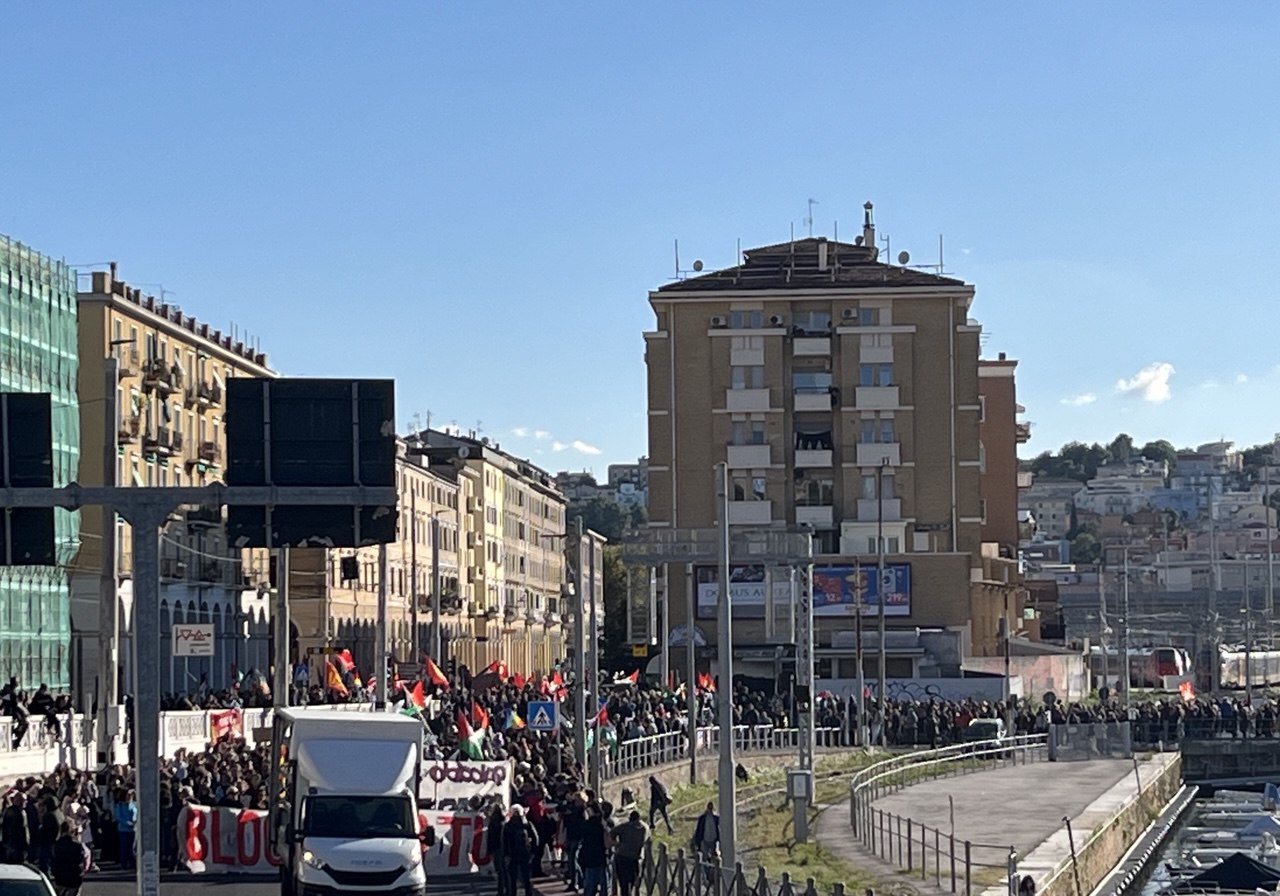 Dopo il corteo di ieri sera ad Ancona con centinaia di persone che hanno invaso il centro cittadino bloccando il traffico, rispondendo all’appello “Blocchiamo tutto” della rete dei Centri sociali delle Marche e di USB, dalle ore 16.00 è bloccato il Valico da Chio del porto di Ancona; non arrivano e partono navi e sono bloccate anche le strade intorno.