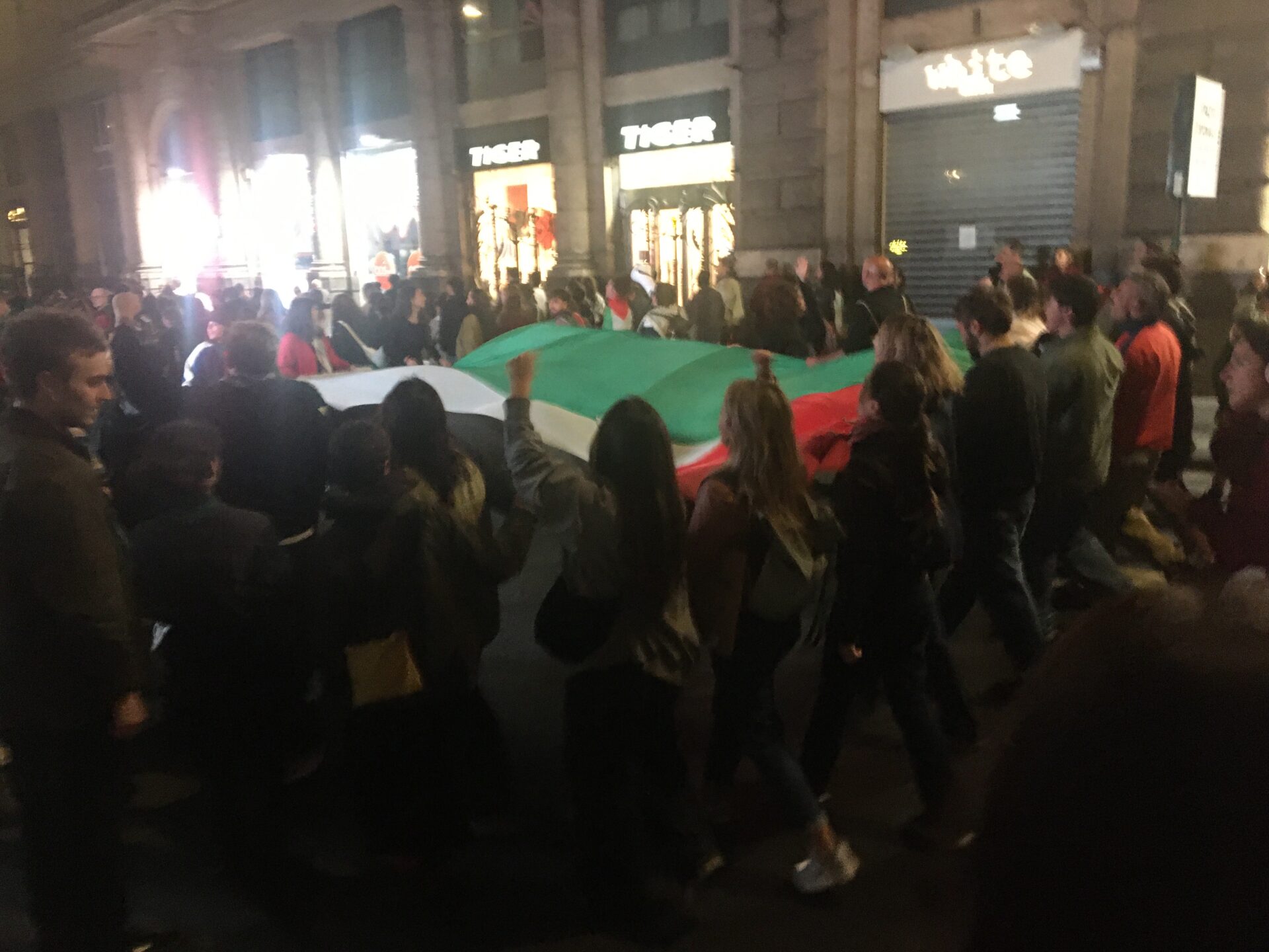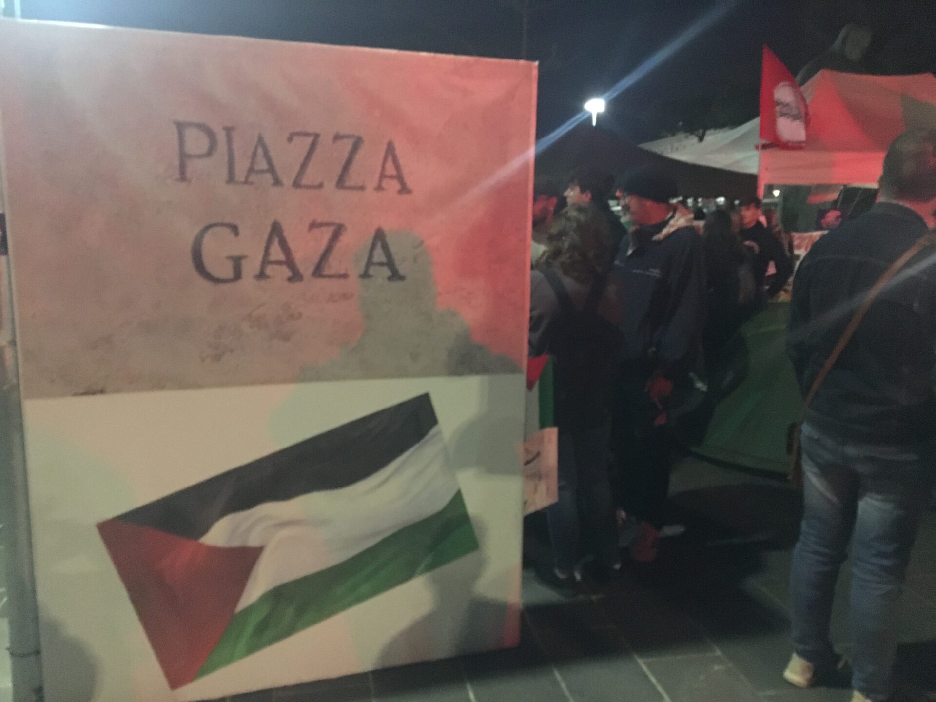 Qui una parte è ritornata al presidio di “Piazza Gaza”, mentre un altro nutrito gruppo, formato soprattutto da instancabili studenti ha scelto di continuare, improvvisando un’ulteriore prosecuzione del corteo divenuto a questo punto, superata la mezzanotte, notturno. Infine moltissime persone, a mio parere infastidite o disorientate da questa divisione finale, decidevano di fermarsi esattamente dove i due tronconi del corteo si erano divisi e pertanto continuavano a presidiare ben oltre la mezzanotte Piazza della Repubblica.