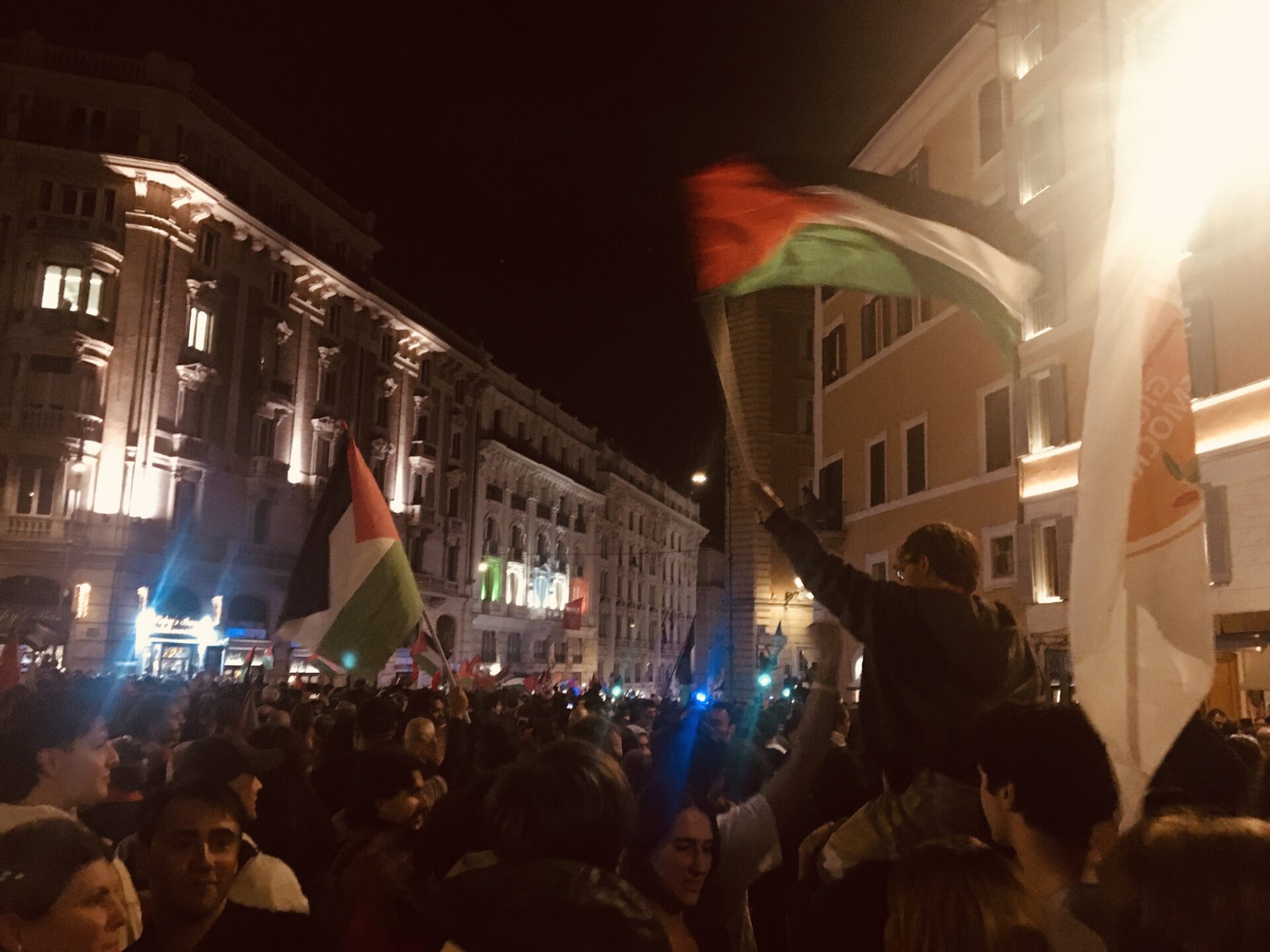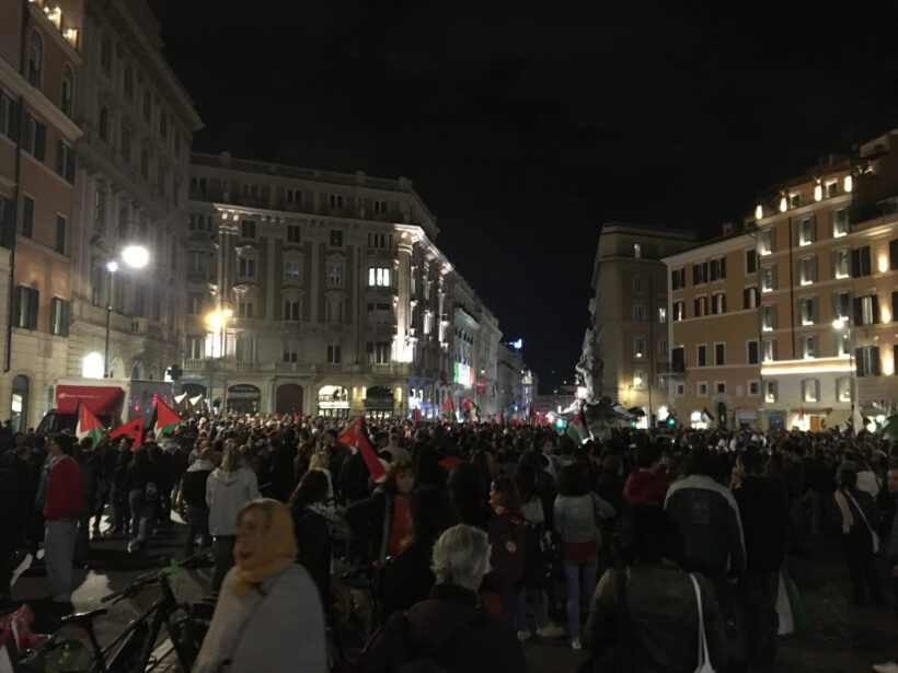 Rispondendo all’appello lanciato dalla Global Sumud Flotilla, anche a Roma in tarda serata si sono concentrate migliaia e migliaia di persone, prima nella piazza antistante la Stazione Termini, ribattezzata per l’occasione Piazza Gaza, dove da giorni c’è un presidio permanente e dove venivano proiettate su un grande schermo le immagini provenienti dalle imbarcazioni della Flotilla.