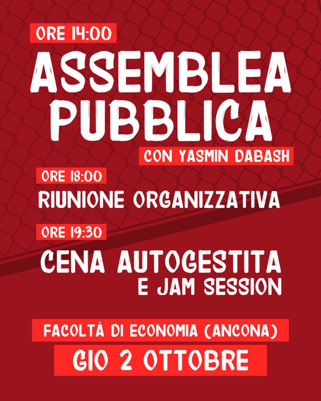 Nella giornata del 2 ottobre le realtà studentesche del territorio marchigiano indicono un’assemblea in cui verrà proclamata l’occupazione della Facoltà di Economia Giorgio Fuà ad Ancona in sostegno alla resistenza palestinese e alla Global Sumud Flotilla.