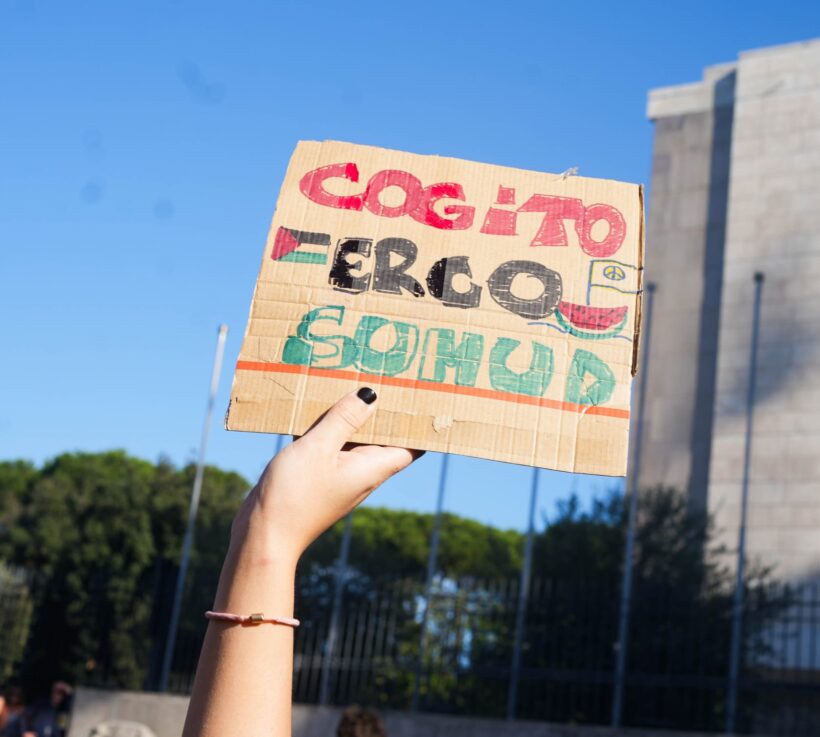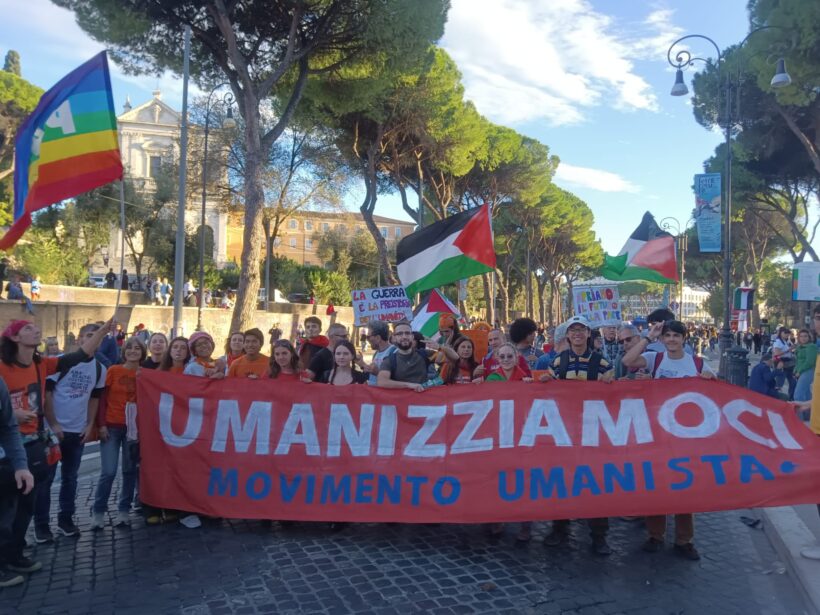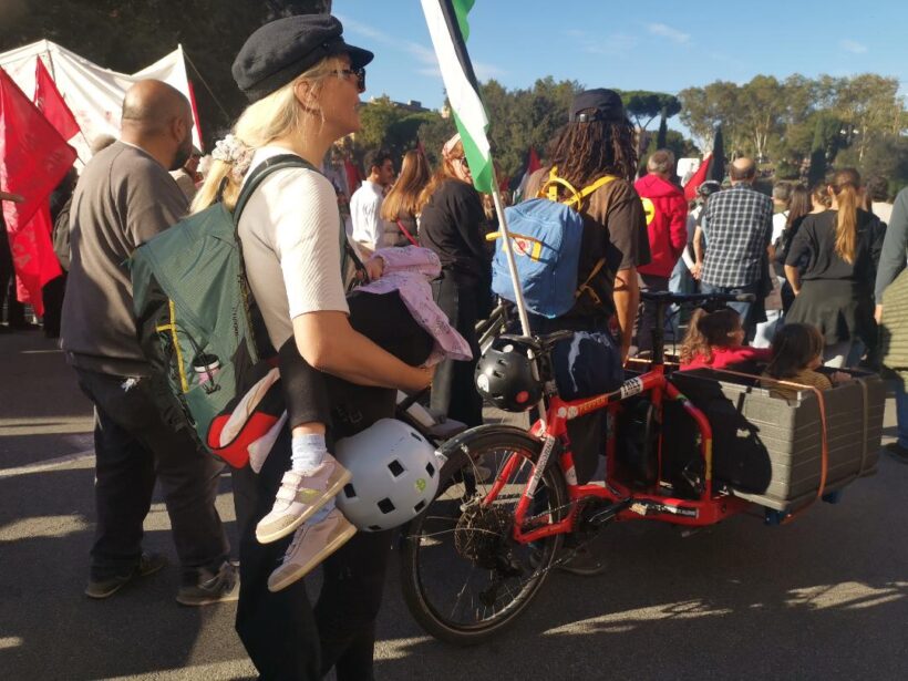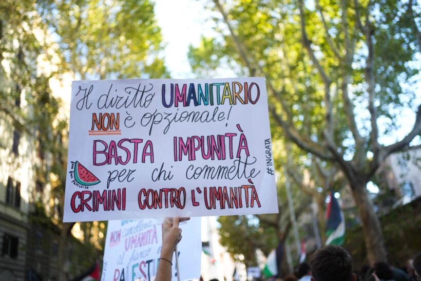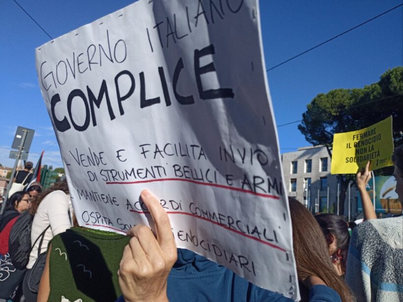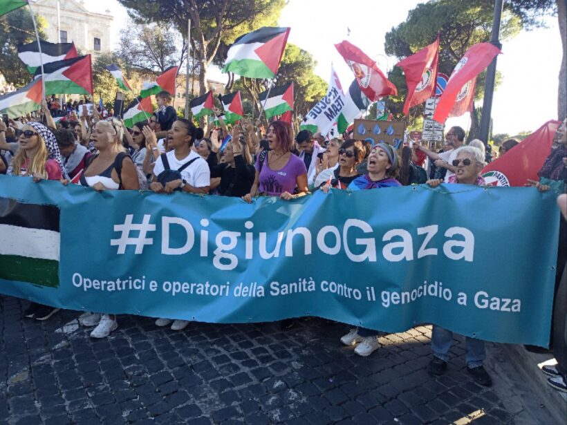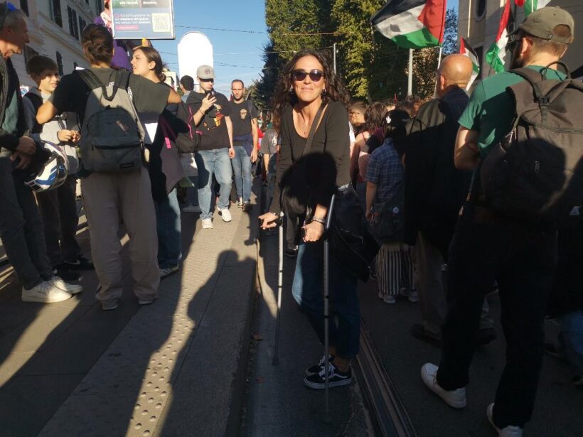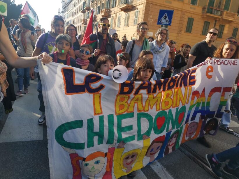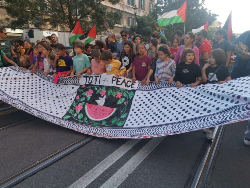 Queste le richieste, sotto forma di slogan, lanciate dal popolo solidale con la Palestina a chi ci governa: “Nessuna arma, nessun soldato/fuori l’Italia dalla Nato”. “Bloccare Israele non è reato”. “Il popolo sa da che parte stare, Palestina libera dal fiume al mare”. “Siamo il grido altissimo e feroce/di tutti quei bambini che più non hanno voce”. “Siamo tutti antifascisti!”. “Netanyahu pezzo di merda”. “Salvini, Tajani, Meloni: dimissioni!”. Una folla ordinata, nonviolenta, assieme ai genitori molti i piccoli che, a volte, hanno lanciato slogan attraverso i megafoni. Altri adulti alzando una grandissima bandiera palestinese sotto la quale i bambini andavano a nascondersi, hanno dato vita a un gioco. Una ragazza con le stampelle si è fatta tutto la manifestazione, dall’inizio alla fine. Questo il popolo che ha sostenuto la coraggiosa missione della Global Sumud Flotilla, un popolo sicuramente nonviolento, tanto che apprendendo di scontri con la polizia da parte di alcuni a corteo finito, si è meravigliato sentendoli estranei imbecilli, quando non volutamente inviati a provocare per svalutare la protesta.
