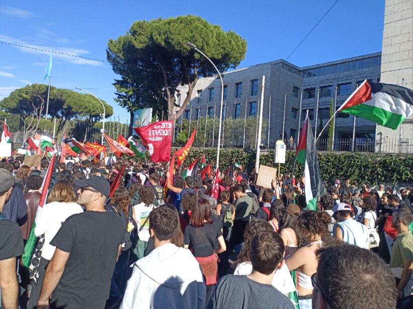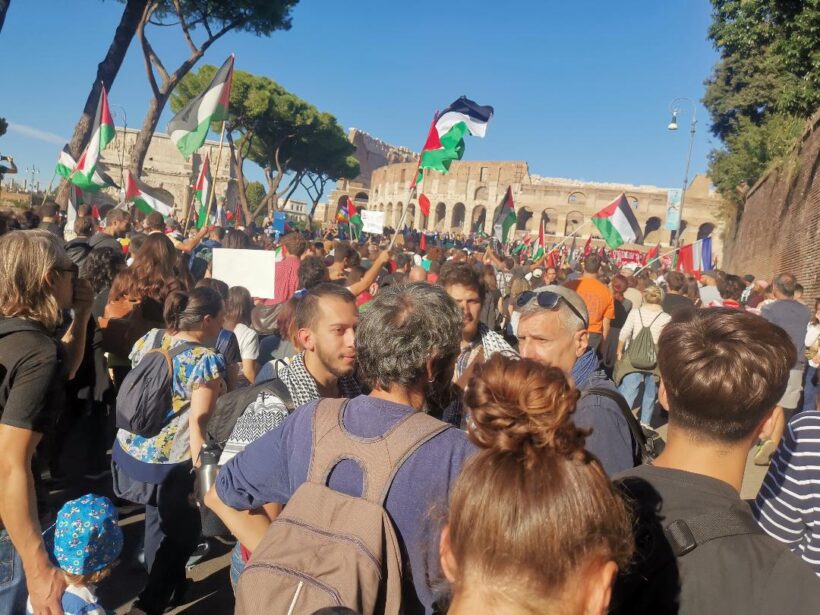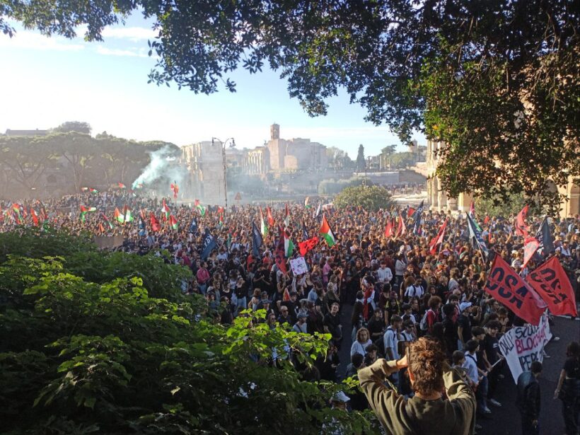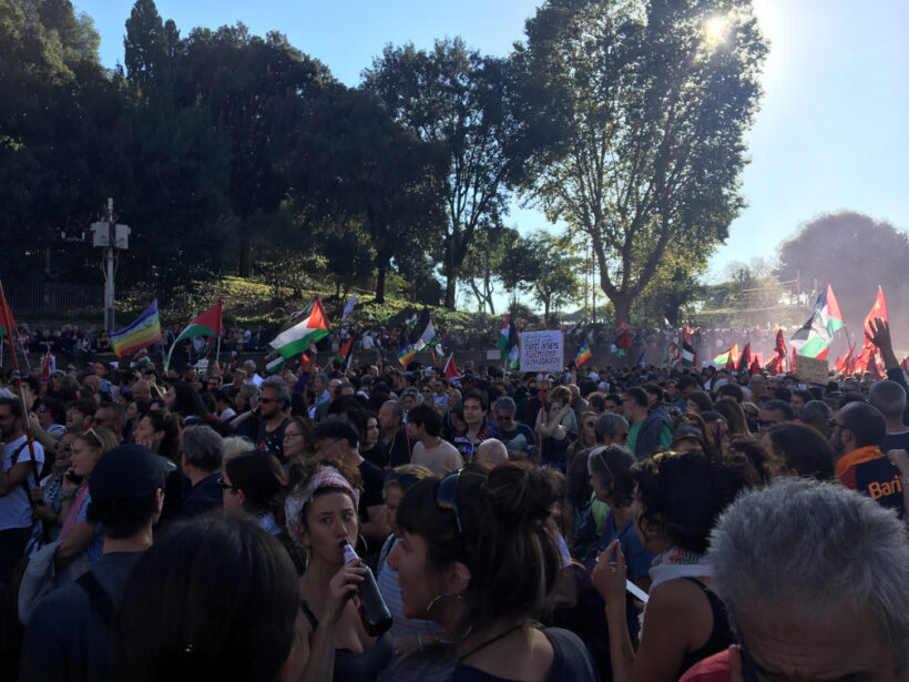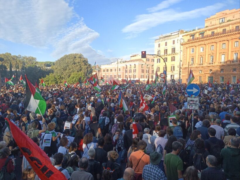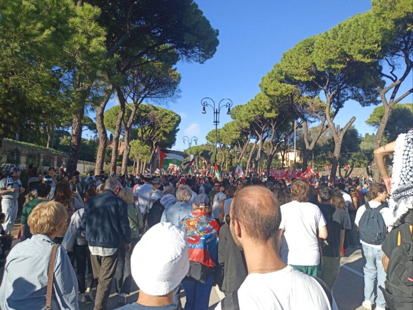 Gli organizzatori parlano di oltre un milione di partecipanti alla manifestazione nazionale per Gaza del 4 ottobre a Roma. Cosa certa è che la testa del corteo, partita alle 14.30 da Porta San Paolo, poco prima delle 17.00 era arrivata a Piazza San Giovanni, punto d’arrivo, mentre la coda era ancora al punto di partenza. Una marea di gente, che raramente è possibile vedere. Il corteo da Porta San Paolo a Piazza San Giovanni ha sfilato lungo viale della Piramide Cestia, piazza Albania, viale Aventino, piazza di Porta Capena, via di San Gregorio, via Celio Vibenna, piazza del Colosseo, via Labicana e via Merulana. Un lungo tratto del centro di Roma, composto di larghi viali e strade che la folla occupava per intero.