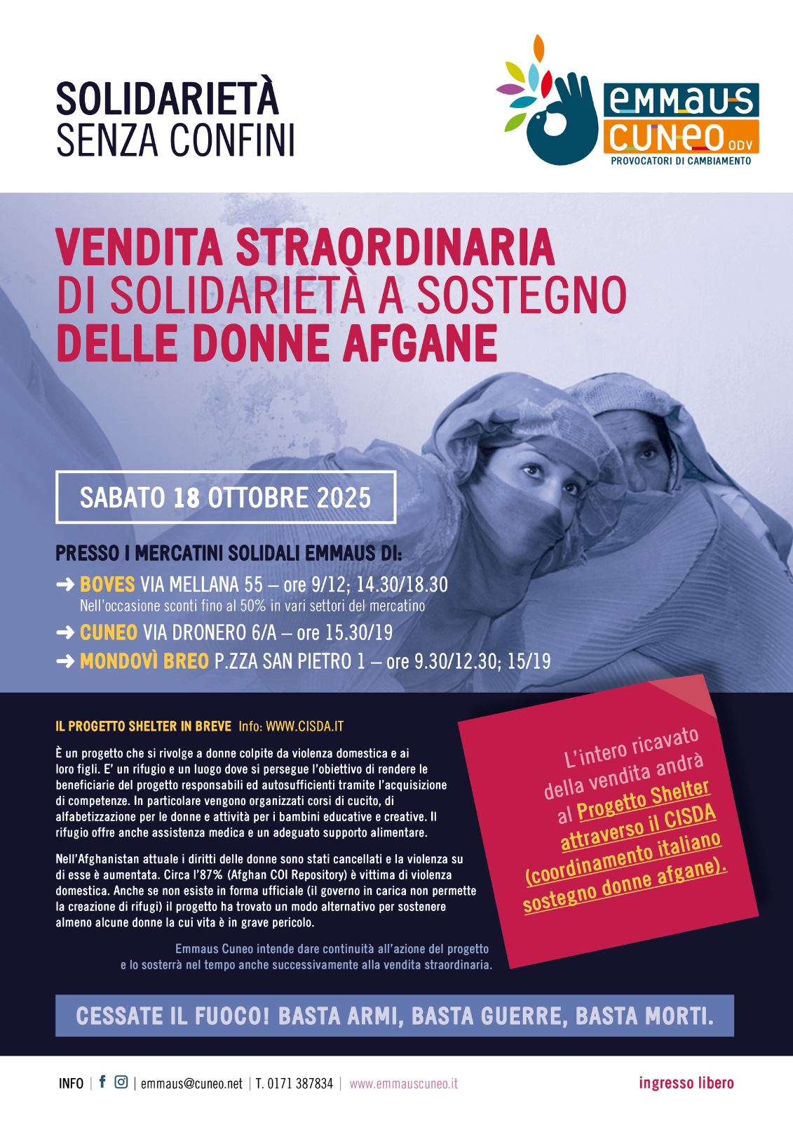 Una vendita straordinaria di solidarietà a favore del progetto Shelter del CISDA (Comitato Italiano Sostegno Donne Afghane) si terrà sabato 18 ottobre presso i mercatini Emmaus di Boves (nell’occasione anche sconti fino al 50% in alcuni settori), Cuneo e Mondovì.