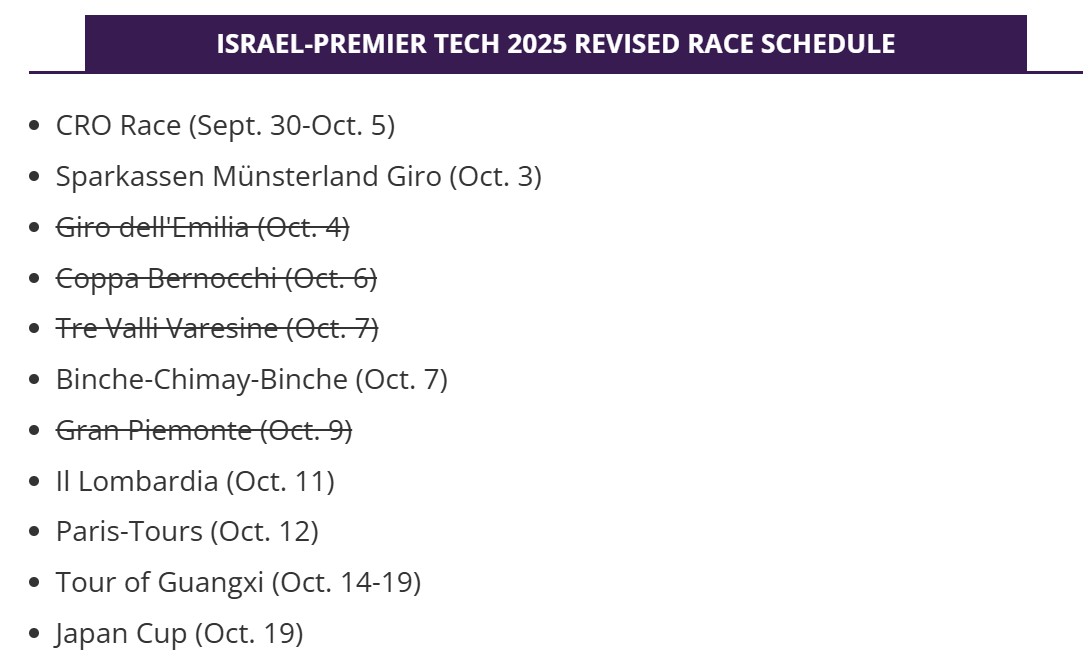Nell’infografica sottostante ripresa sempre da Cyclingnews è riportato il calendario rivisto delle gare 2025 che la IPT aveva, ha o avrebbe avuto in programma: