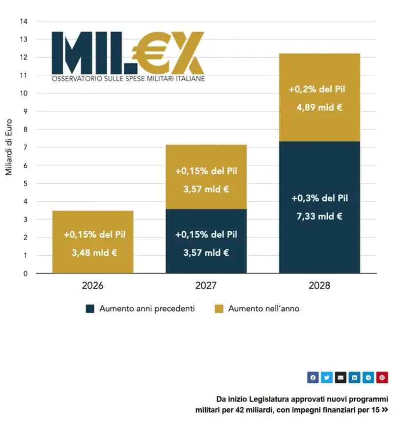 Citiamo a tal riguardo una nota della scheda di MIlex appena pubblicata: “Da notare come il nostro calcolo “complessivo” non sia in contraddizione con la cifra di 12 miliardi indicata da altre fonti, perché in tal caso ci si riferisce esclusivamente alla somma degli aumenti tra un anno e l’altro (3,5 mld nel 2026 + 3,6 mld nel 2027 + 4,9 mld nel 2028), senza però tenere conto del cumulo degli aumenti e quindi della spesa aggiuntiva totale sul triennio riferita alla differenza tra lo scenario “in aumento” deciso dal Governo come avvicinamento al nuovo standard NATO e lo scenario in cui si fosse mantenuto il precedente standard (senza quindi aumenti). Come già detto in sede di precedenti analisi previsionali, immediatamente successive agli annunci NATO, tale impatto dipende dal profilo di aumento scelto dal Governo (perché paradossalmente essendo la richiesta NATO solo quella di arrivare al 3,5% + 1,5% nel 2035 un Governo potrebbe anche alzare la spesa anche solo in quell’ultimo anno del periodo). Inizialmente avevamo assunto una crescita a gradini “equivalenti” pari a +0,3% annuo mentre ora con il DPFP da pocoapprovato abbiamo una scelta definita e “reale”, almeno per i prossimi tre anni. Dunque, è possibile concretizzare ciò che interessa a noi fin dal principio: stimare l’effetto in aumento “complessivo” rispetto al precedente scenario di richieste NATO, proprio per valutare quale impatto abbia sulla spesa pubblica l’allineamento anche del Governo italiano a tale nuovo standard. E’ ovvio, dunque, che per l’analisi qui proposta non contino solo gli aumenti “tra un anno e l’altro” ma le differenze complessive rispetto allo scenario base (precedente) di standard al 2% del PIL”.