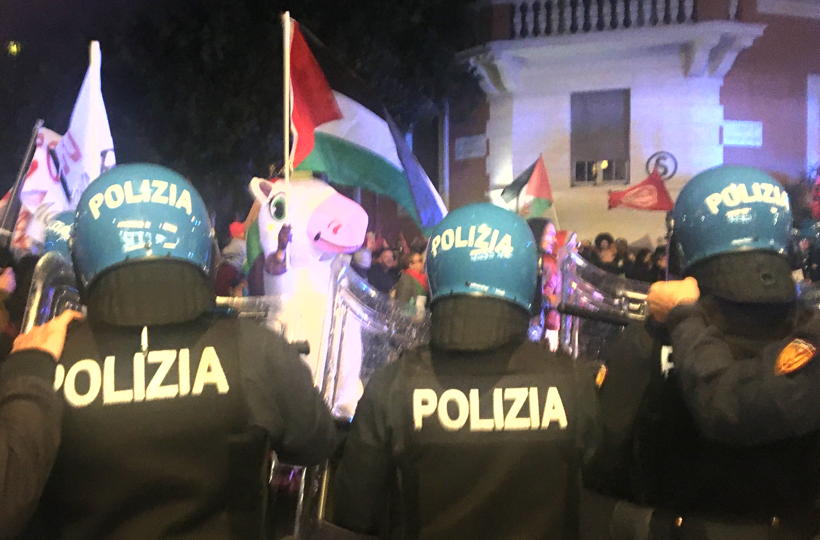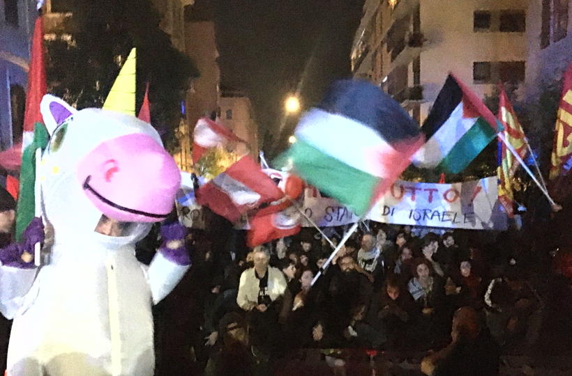 Si è alzato quindi uno scherzoso, irriverente coro: “Poliziotto ma che ci stai a fare? A casa ci sono i piatti da lavare, i panni da stirare il cane da pisciare”. Dopo una nuova trattativa finalmente i manifestanti hanno potuto uscire da quella che sembrava una vera trappola sventolando le bandiere palestinesi, tra due ali di poliziotti minacciosamente in tenuta antisommossa. Per difendere i diritti del popolo palestinese e la libertà in Italia è assolutamente necessario che la mobilitazione riprenda forza e vigore.