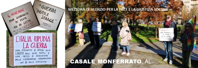 CASALE MONFERRATO, AL – flashmob : esponendo la bandiera della pace e cartelli, alcuni praticanti la settimanale Mezzora di silenzio per la pace e la giustizia sociale hanno presenziato la deposizione della corona di alloro al monumento cittadino dedicato ai Caduti di Casale Monferrato [vedi foto] a cui, accanto e insieme alle autorità cittadine e rappresentanti dei corpi delle Forze armate e delle associazioni militari e paramilitari, partecipavano le scolaresche ‘intruppate’ [reportage e mockdocumentary]