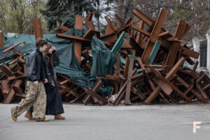 Dopo il ritorno dall’evacuazione, Kiev appariva vuota. Faceva freddo e a causa delle gelate tardive gli alberi non erano ancora fioriti. È così che ricordo il mese di aprile del 2022 a Kiev: congelata – in attesa di notizie, in ascolto di esplosioni che via via sono diventate meno frequenti e poi sono quasi svanite. Con l’arrivo del caldo, gli alberi fiorirono e le strade divennero gradualmente più affollate, ma la sensazione di quiete rimase. Lo noto ancora: cavalli di frisia anticarro per le strade, monumenti avvolti per protezione, finestre di edifici strategicamente importanti coperte da sacchi di sabbia. Non tutti tornarono. Gli alberi non fioriscono più come una volta. Kiev è cambiata per sempre: è diventata parte della guerra e ora si muove in sincronia con essa.
