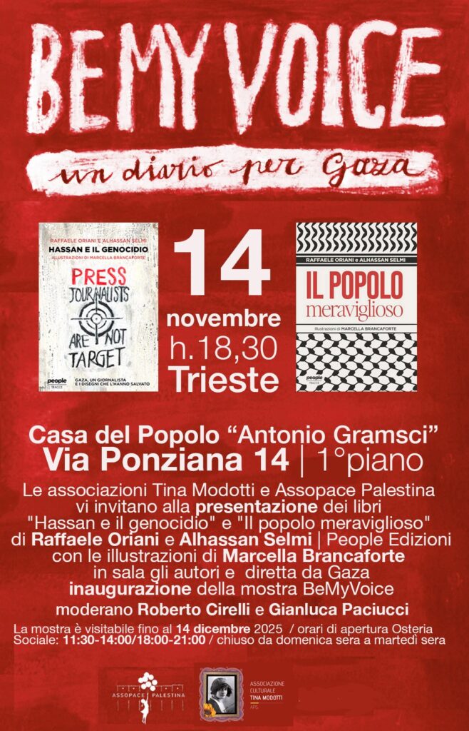 Venerdì 14 novembre alle ore 18.30 presso la Casa del popolo “A. Gramsci” (1° piano) l’Associazione culturale Tina Modotti aps e Assopace Palestina Trieste invitano alla presentazione dei libri Hassan e il genocidio e Il popolo meraviglioso di Raffaele Oriani e Alhassan Selmi (people edizioni) con le illustrazioni di Marcella Brancaforte.