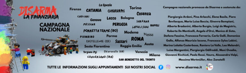 La campagna nazionale DISARMA LA FINANZIARIA è finalmente partita. Sta attraversando il Paese e, nelle prossime settimane, farà tappa in 35 città e territori.