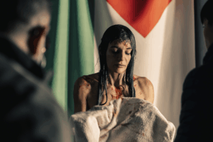 Il video si apre con un’immagine quasi claustrofobica: una figura femminile, velata di bianco, chiusa in un involucro che ricorda un sudario insanguinato. È il simbolo di una prigionia interiore, della paura e del dolore che immobilizzano l’essere umano.