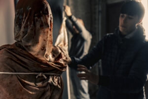 Nella sequenza finale, la figura alza le mani verso l’alto, i palmi aperti verso chi guarda.