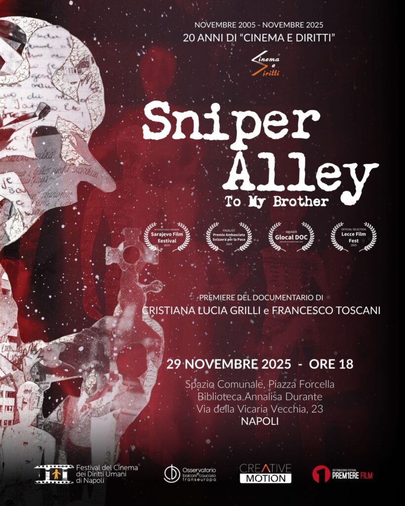 “Per la forza con cui intreccia memoria personale e storia collettiva, restituendo allo spettatore uno sguardo vivo e necessario su ciò che la guerra lascia e ciò che la memoria può ancora salvare. Attraverso la ricerca di un fratello perduto, il film costruisce un linguaggio universale che parla di lutto, umanità e rinascita”. Con questa motivazione il docufilm ‘Sniper Alley – To My Brother’ si è aggiudicato il premio principale come miglior documentario al Glocal DOC 2025 di Varese. Un riconoscimento prestigioso per il lavoro incentrato sulla storia di Džemil Hodžić e sul suo progetto “Sniper Alley Photo” (che ha l’obiettivo di ricostruire la memoria dell’assedio di Sarajevo attraverso le immagini dei più grandi fotoreporter di guerra), nato dopo la tragica perdita del fratello Amel, ucciso da un cecchino a soli 16 anni. Il docufilm – realizzato dallo studio di produzione con sede a Pescara Creative Motion, che da anni porta avanti progetti di impegno civile e culturale a livello internazionale – continua a essere proiettato in contesti autorevoli. Dopo la presentazione nell’aula magna dell’Università di Anversa seguirà la prima nazionale italiana, con la proiezione in occasione del XVII Festival del Cinema dei Diritti Umani di Napoli alla presenza di numerosi ospiti.