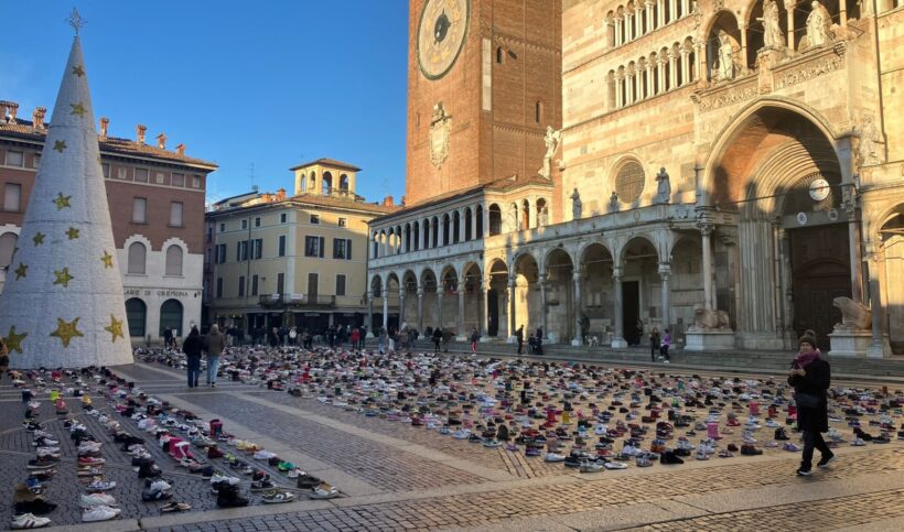 Nella giornata dell’8 dicembre i docenti del gruppo LA SCUOLA PER LA PALESTINA insieme al coordinamento TAVOLA DELLA PACE e ad ALAC /Associazione Latinoamericana di Cremona lo hanno mostrato esponendo altrettante paia di scarpe nell’ampio sagrato davanti al duomo cittadino.