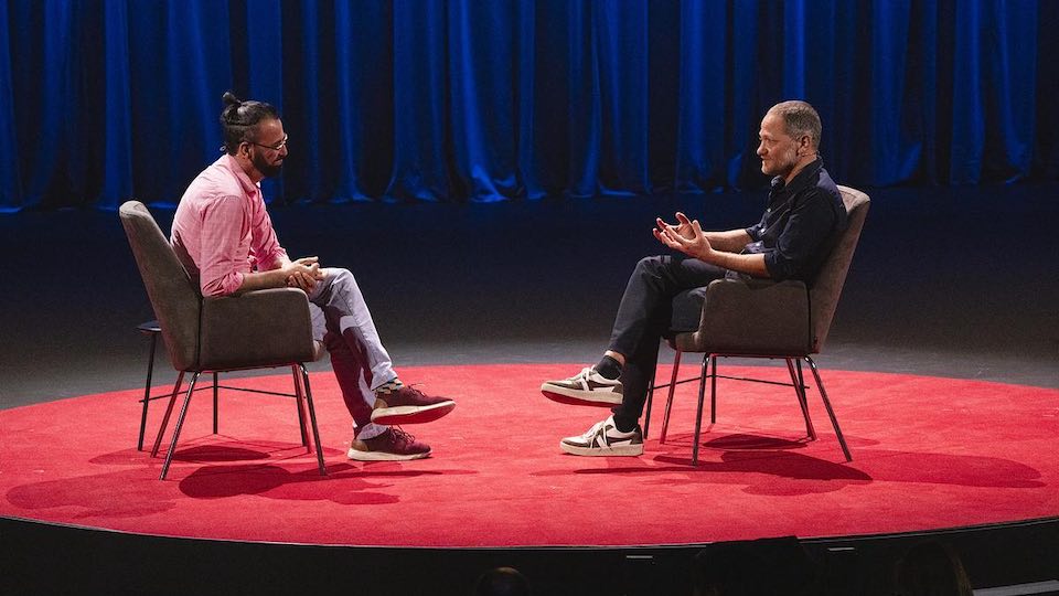 Maoz Inon and Aziz Abu Sarah speak at SESSION 1 at TED2024: The Brave and the Brilliant, on Monday, April 15, 2024. Vancouver, BC, Canada. Photo: Ryan Lash / TED