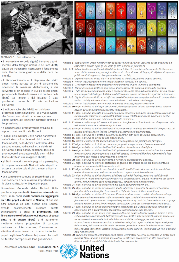 Il testo della Dichiarazione universale dei Diritti Umani – che il 10 dicembre nel 1948 venne proclamata dall’Assemblea Generale delle Nazioni Unite riunita a Parigi deliberando la Risoluzione 217 III A approvata da 48 su 58 stati membri (8 astenuti e 2 assenti alla votazione) – venne pubblicato in un manifesto mostrato in due fotografie emblematiche: quella della sua presentazione a Eleanor Roosevelt, vedova del presidente degli USA fino al 1945 e soprannominata First Lady of the World perché si era tanto prodigata per l’emancipazione delle donne e per la tutela dei diritti civili; quella in cui viene osservato da un gruppo di bambini…