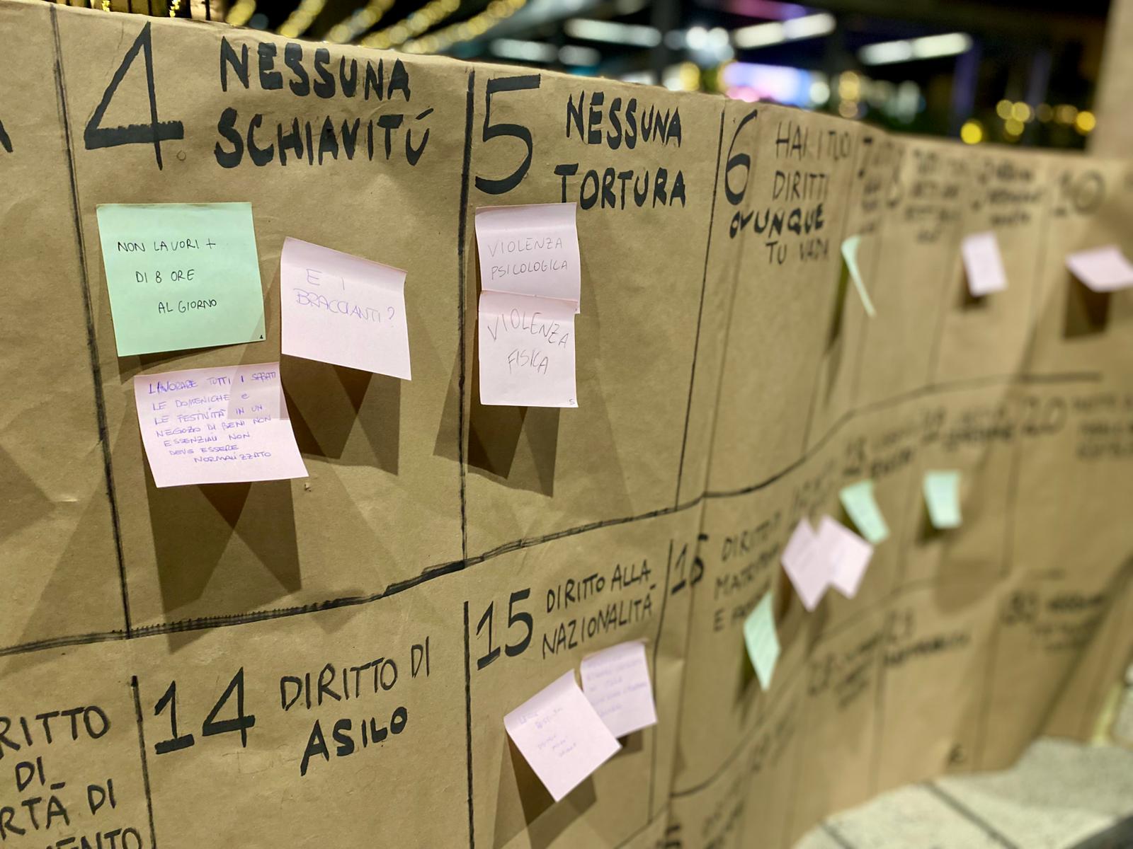 Nella piazza del ritrovo è stato creato un grande cartellone con tante caselle quanti sono gli articoli della Dichiarazione dei diritti umani e si è invitata la gente a riflettere: su ogni casella si potevano applicare dei biglietti con frasi che facessero pensare alla possibilità di godere dei diritti, oppure qualche testimonianza nel vederseli negare. C’è la consapevolezza di vivere in una parte di mondo dove ognuno di noi può beneficiare di diritti basilari, ma in altre zone, soprattutto in quelle di guerra, i diritti umani sono violati costantemente.