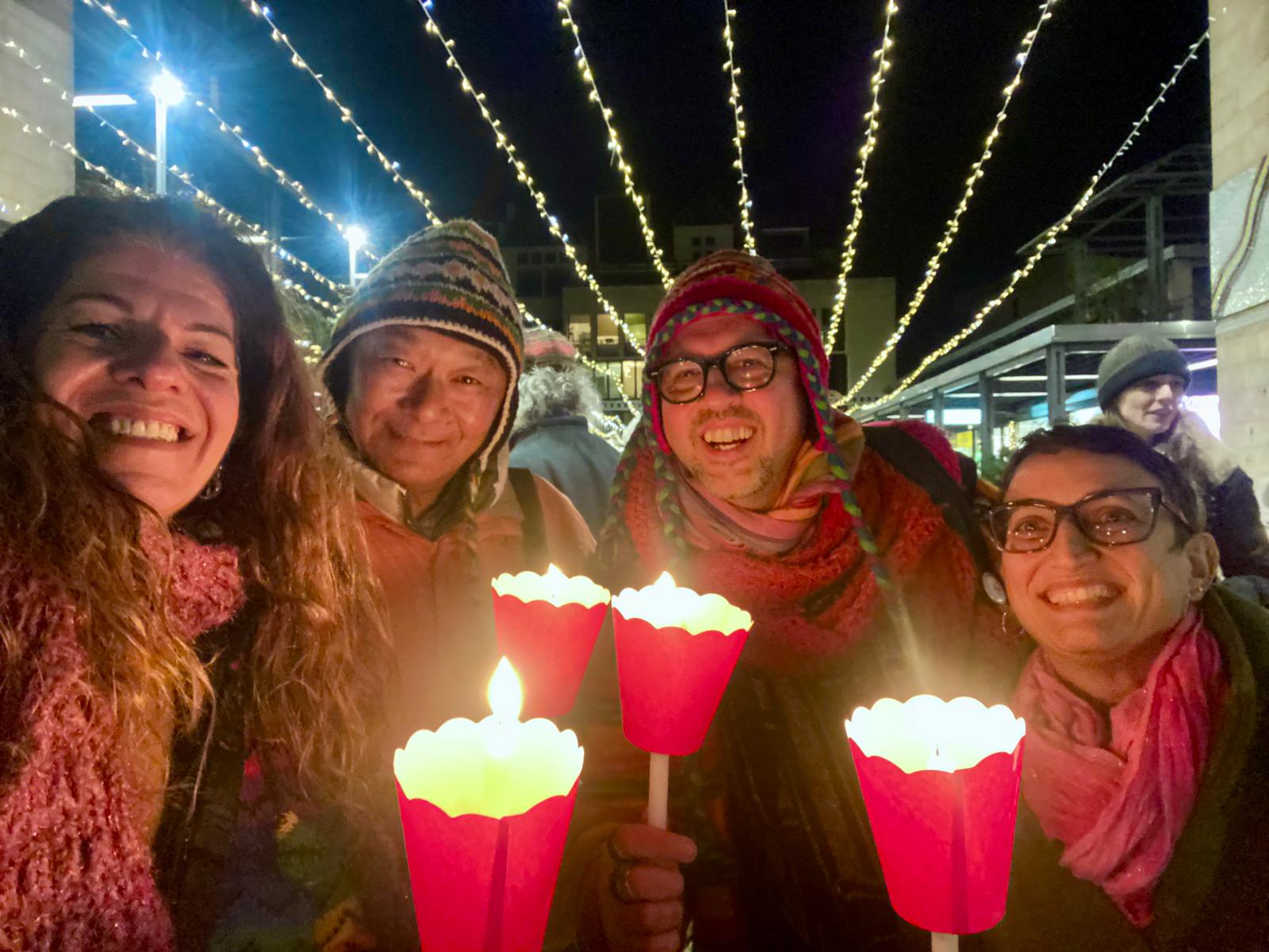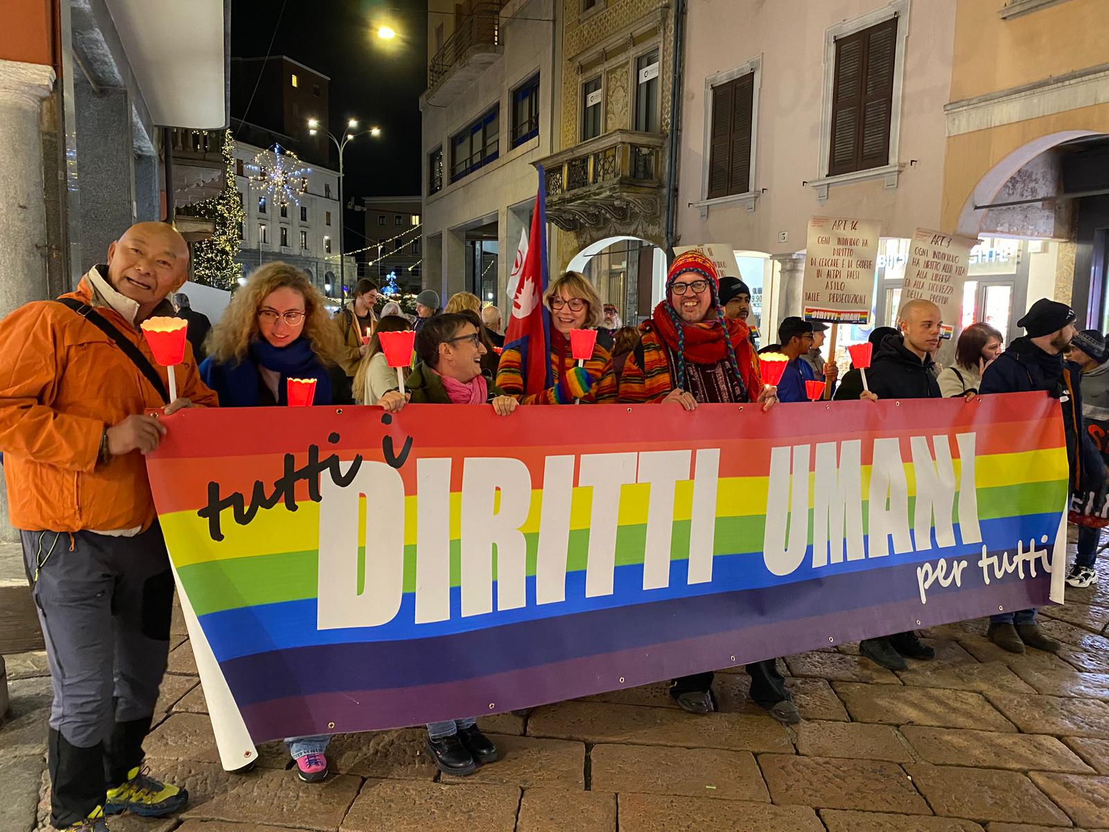 Un grande striscione con i colori dell’arcobaleno e la scritta “tutti i DIRITTI UMANI per tutti” era alla testa del corteo che ha attraversato le strade del centro illuminate per l’arrivo del Natale. In molti per strada si sono fermati a osservare la gente che passava con le fiaccole accese e in tanti fotografavano e filmavano sorridenti.