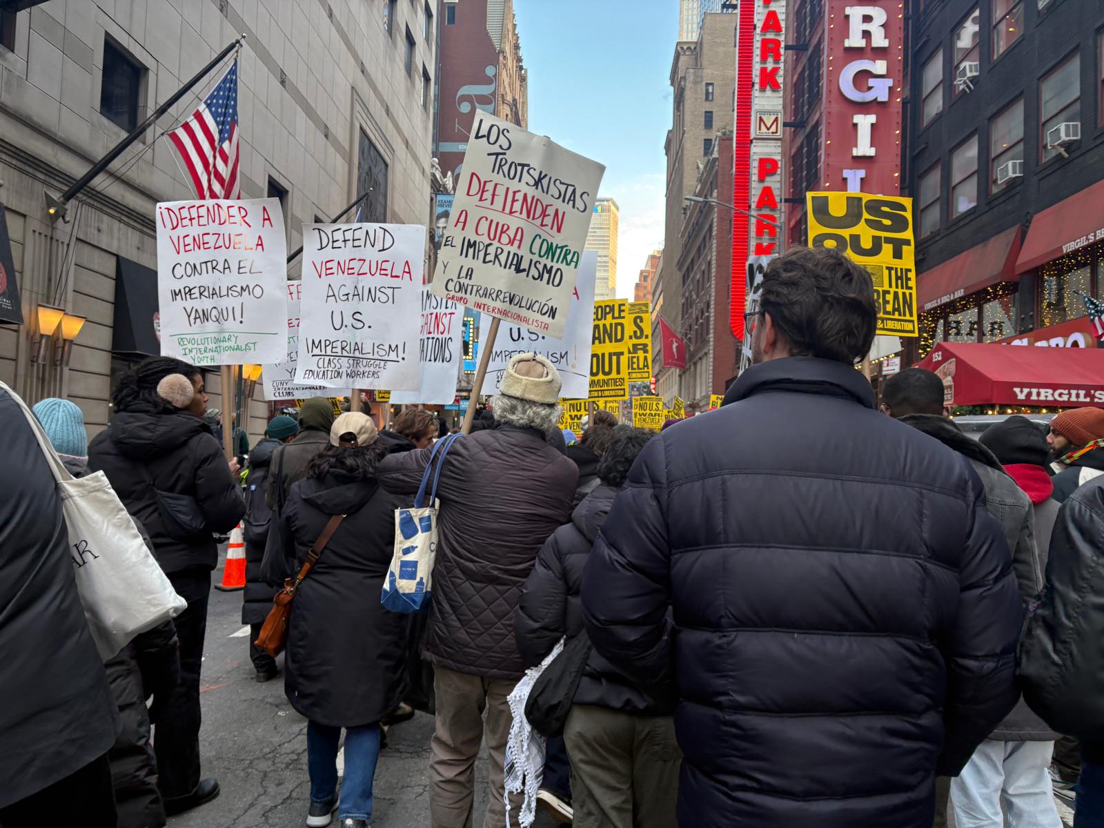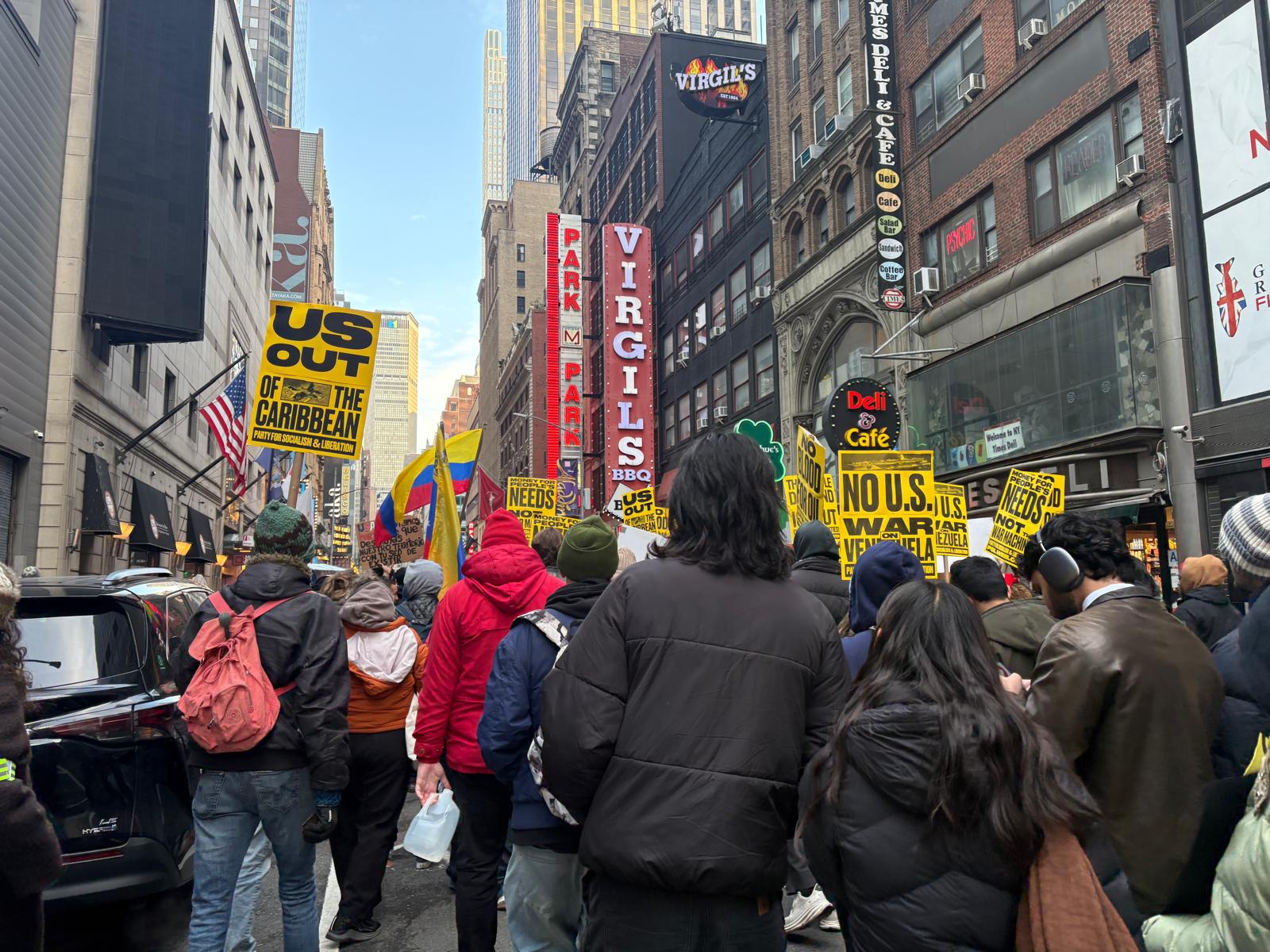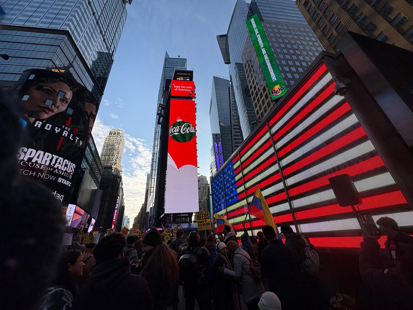 Qualche giorno fa è stata indetta una giornata nazionale di solidarietà al popolo venezuelano che si è tenuta sabato 6 dicembre in tutto il Paese. A New York City l’appuntamento era a Times Square: sotto i grattacieli ricoperti da mastodontici schermi su cui scorrono video di Babbo Natale che beve tutto contento la Coca Cola e di spiagge tropicali per una fuga a cinque stelle dallo stress moderno, si sono ritrovati attivisti ed esponenti della comunità latina; insieme a loro c’erano i giovani del movimento per la Palestina libera e un buon numero di rappresentanti della storica comunità nera newyorkese (che per una volta hanno alzato l’età media dei partecipanti).