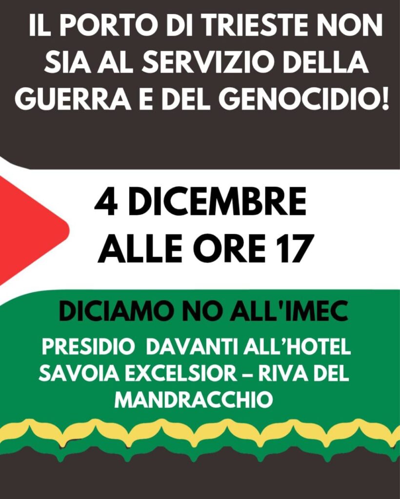 L’Indo-Mediterranean Business Forum, convocato per il 4 dicembre a Trieste presso l’hotel Savoia-Excelsion e il 5 alla sala congressi del porto vecchio, è l’ennesimo convegno di politici, imprenditori e diplomatici – tra cui figura l’ex ambasciatore di Israele in India, Naor Gilon – per discutere del passaggio del corridoio IMEC dal porto di Trieste. Un progetto che vuole trasformare la nostra città in un porto al servizio degli interessi della NATO e di Israele, inserendola in questo modo nella filiera della guerra globale.