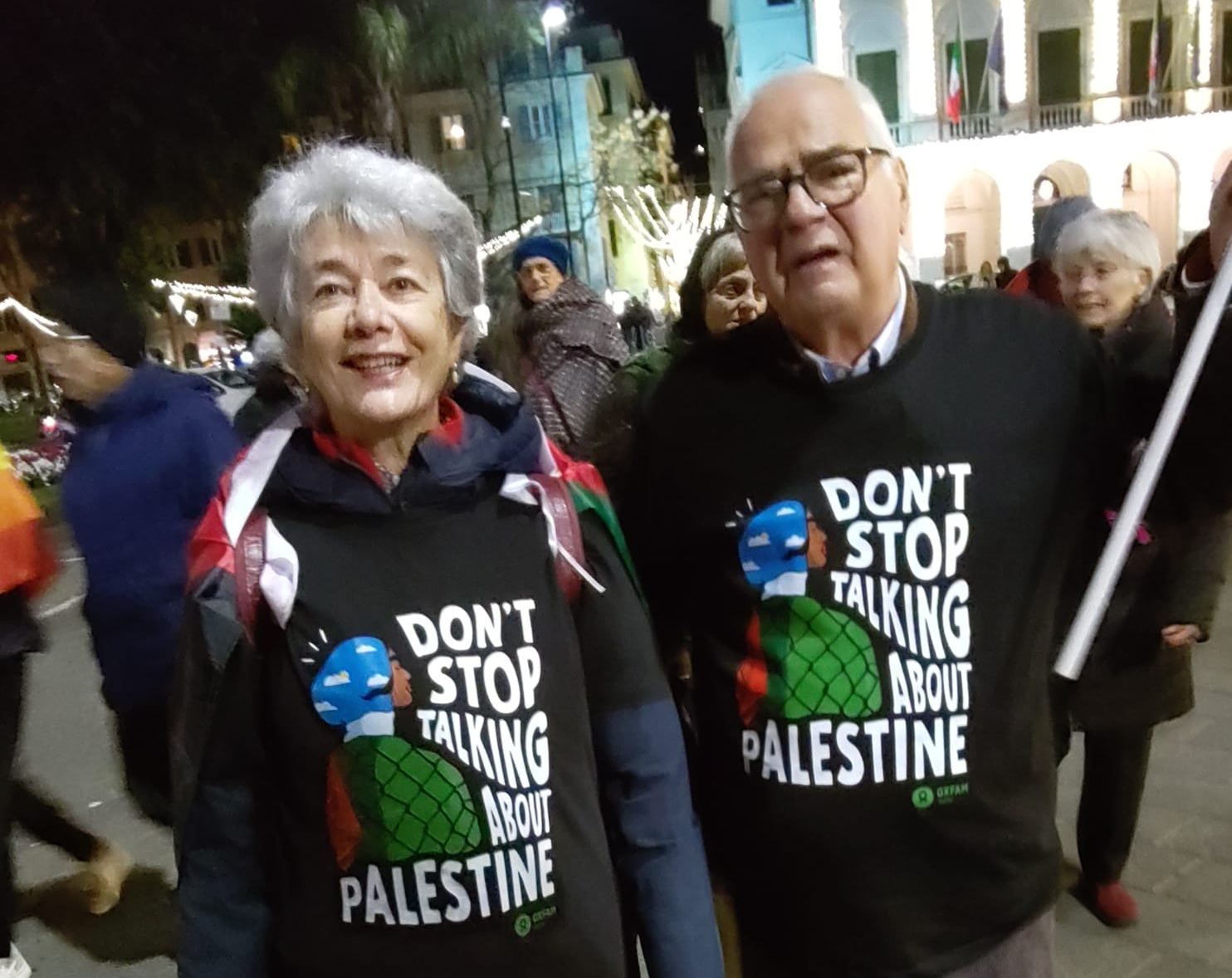 Un altro cartello citava la recente e importante presa di posizione della CEI (i vescovi italiani) contro il riarmo europeo e la necessità di boicottare aziende e banche armate. Particolarmente azzeccato in questo periodo, lo slogan riportato su alcune magliette di Oxfam Italia: DON’T STOP TALKING ABOUT PALESTINE.
