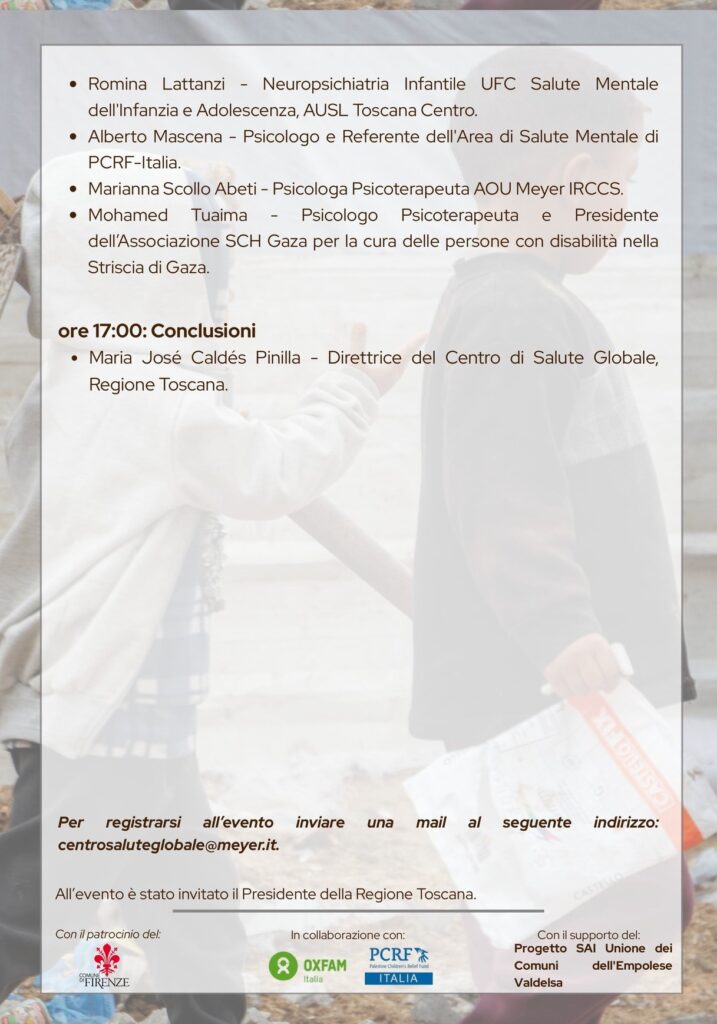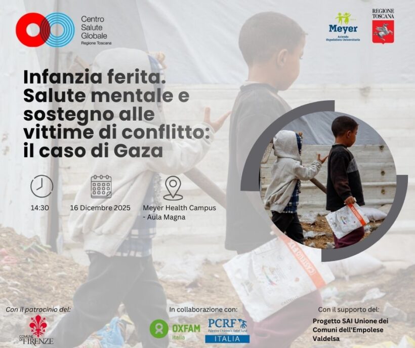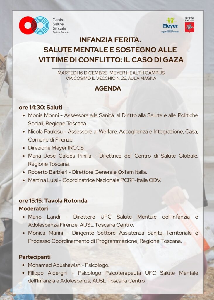 Organizzato dal Centro di Salute Globale della Regione Toscana e dall’AOU Meyer IRCCS, con il coinvolgimento di Oxfam Italia e PCRF-Italia, l’incontro ha messo al centro la salute mentale dei bambini colpiti dai conflitti, con uno sguardo specifico sulla Striscia di Gaza, oggi teatro di una devastazione che colpisce in modo sistematico l’infanzia, le famiglie e i sistemi di cura.