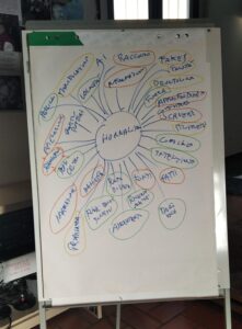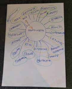 Si è partiti con un brain storming attorno ai concetti di nonviolenza e giornalismo in cui ognuno dei partecipanti ha potuto esprimere le proprie parole chiave.