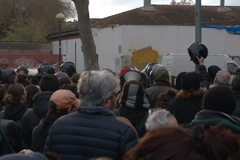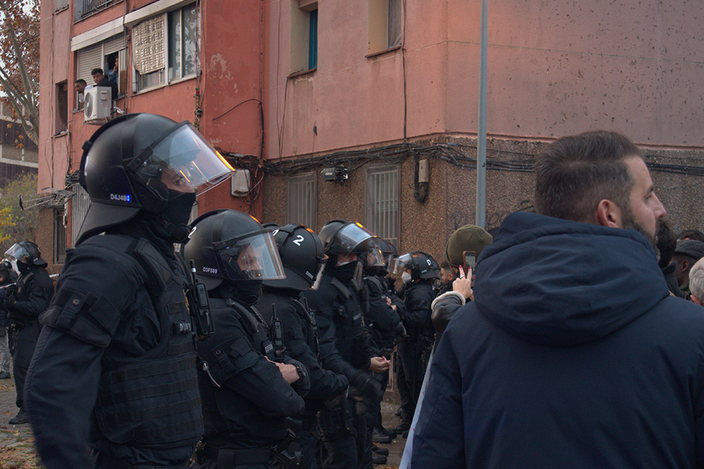 «Nonostante il tempo inclemente, nonostante le mediazioni, nonostante tutto, sembra essere più importante l’opinione di un singolo, il sindaco in questo caso, che ha criminalizzato la maggioranza delle persone» mi spiega una persona che vive nel quartiere. «Hanno strumentalizzato i vicini, ma qui si può vedere quanti siamo davvero». Fin dalla prime ore del mattino, infatti, decine di persone sono accorse per donare sostegno alla causa. Residenti del vicinato, collettivi impegnati nella lotta per il diritto alla casa e sindacati antirazzisti situati di fronte al cordone della polizia hanno espresso la loro solidarietà con cori e urla mentre osservavano le persone uscire dalla struttura con i propri averi. Solo mezz’ora dopo l’inizio dello sgombero si sono verificati momenti di tensione: gli agenti della Àrea de Brigada Mòbil (BRIMO), schierati in assetto antisommossa per impedire l’accesso ai manifestanti, hanno iniziato a caricare le persone, tra cui chi è accorso per protestare e chi aveva appena subito lo sgombero, con spintoni e manganellate.