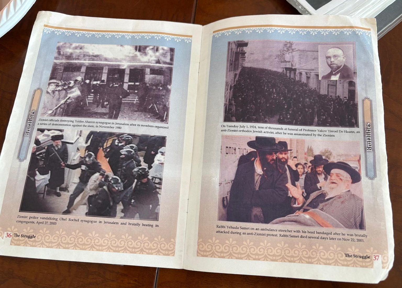 Mentre parla, Rabbi Weiss sfoglia libri, legge passi e mostra fotografie di ebrei come lui picchiati, arrestati, umiliati nel quartiere vecchio di Gerusalemme.