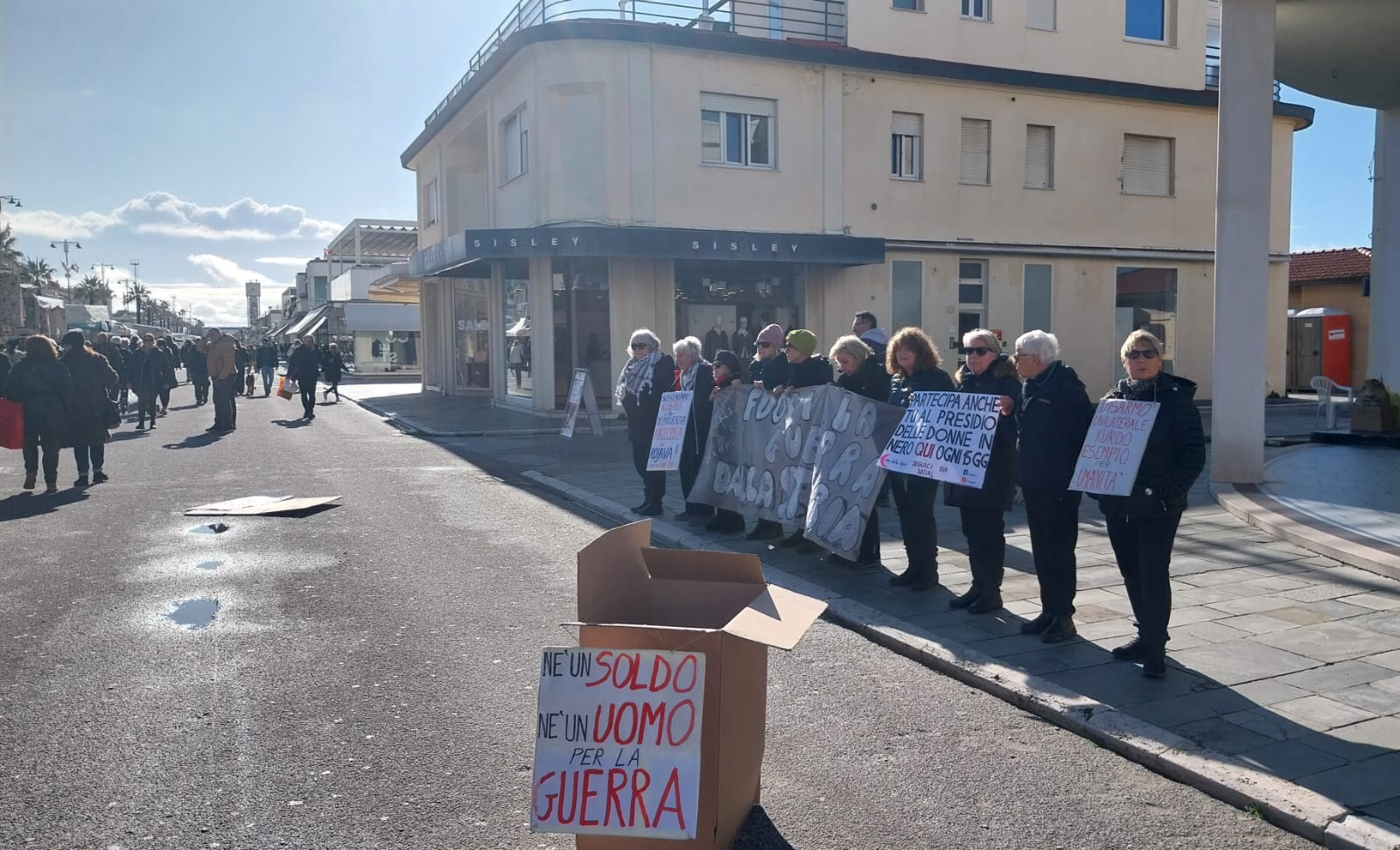 Nel nostro piccolo anche a Viareggio una dozzina di donne in nero si trovano ogni giovedì (giorno di mercato). Il loro striscione “storico” porta una frase lapidaria e definitiva di Lidia Menapace: fuori la guerra dalla storia. A questo si aggiungono svariati cartelli con slogan pacifisti.