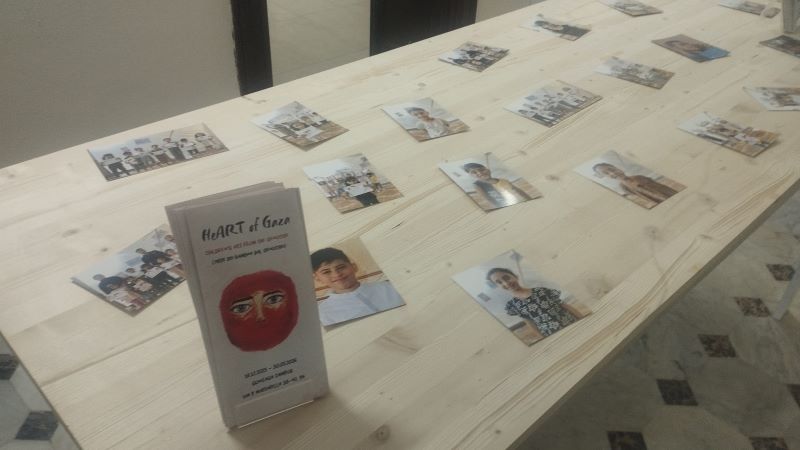 Chiude il percorso della mostra una pianta di ulivo, in tempo di pace presente in ogni cortile di casa della Palestina e qui in una piccola aiuola in vaso, simbolo della natura confinata e martoriata che resiste, come resiste la vita nei sogni dei bambini di Gaza.