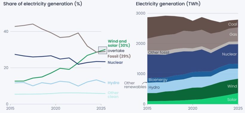 Nel 2025, considerando complessivamente i 27 Stati membri dell’Unione Europea (UE), il volume di elettricità prodotta da fonti eoliche e solari ha superato quello dell’elettricità prodotta da fonti fossili. Si tratta rispettivamente del 30% e del 29% della produzione elettrica, secondo i dati aggregati del rapporto.