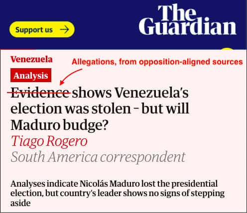 Tuttavia, attraverso un gioco di prestigio verbale, The Guardian ha presenta Nicolas Maduro come un soggetto isolato, e la posizione estremista e negazionista come dominante.