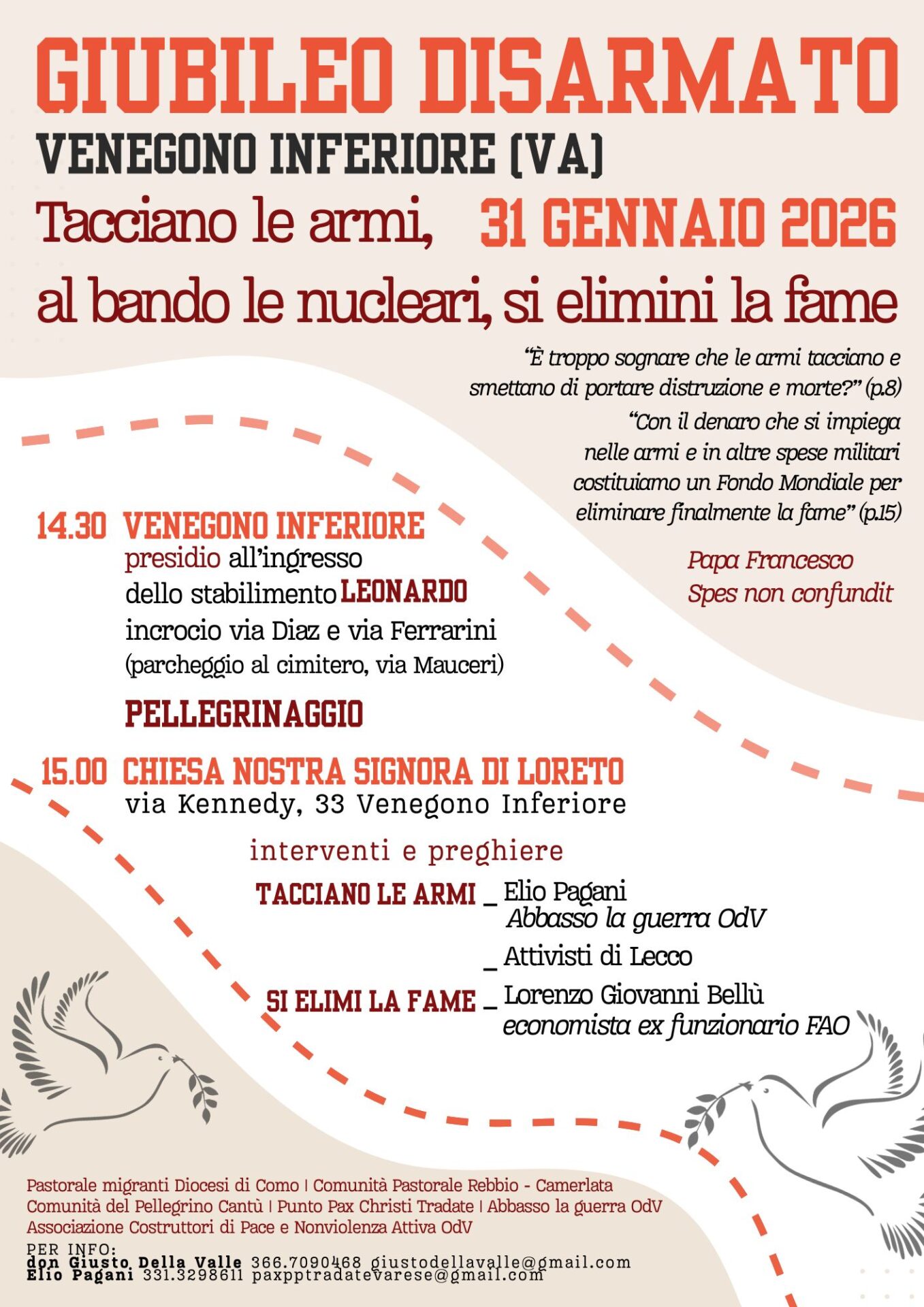 L’iniziativa a Venegono Inferiore, in provincia di Varese, in programma giovedì 31 gennaio 2026 / Giornata per la Pace e il Disarmo è promossa da Punto Pace di Pax Christi di Tradate, Abbasso la Guerra OdV di Venegono, Pastorale migranti Diocesi di Como, Comunità Pastorale di Rebbio Camerlata, Comunità del Pellegrino Cantù, Associazione Costruttori di Pace e Nonviolenza Attiva OdV Luino, che dichiarano: