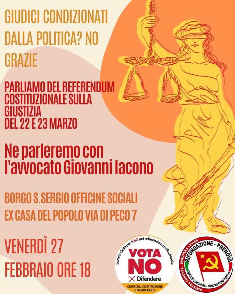 Il Partito della Rifondazione Comunista (Trieste), insieme al gruppo “Società civile per il NO al referendum costituzionale”, invita all’incontro “Giudici condizionati dalla politica? No, grazie” che si terrà venerdì 27 febbraio alle ore 18.00 presso la Officine sociali di Borgo San Sergio (ex Casa del popolo), via di Peco, 7. L’incontro sarà preceduto, mercoledì 25 febbraio dalle 10.00 alle 12.00 in Piazza XXV aprile (Borgo San Sergio) da un volantinaggio informativo.