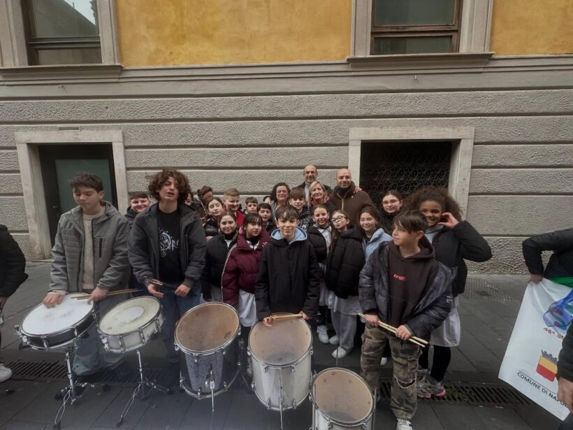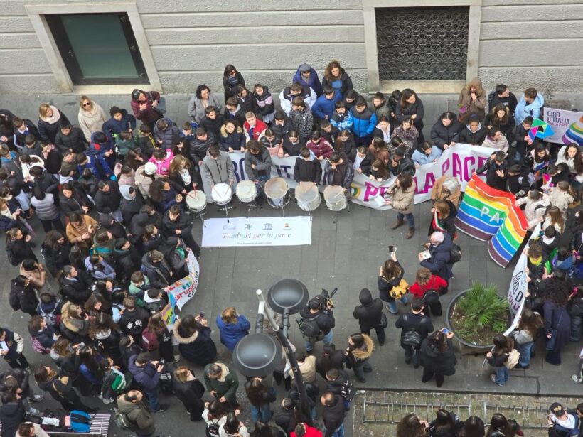 In piazza Municipio gli studenti hanno animato la performance dei “Tamburi per la Pace”, a cura dell’Associazione E.I.P. Italia, trasformando il centro cittadino in uno spazio di partecipazione collettiva. La giornata si è poi conclusa nel Monastero di Santa Chiara con la costruzione simbolica delle “Fondamenta di Pace” e un confronto pubblico alla presenza del sindaco di Napoli Gaetano Manfredi, degli assessori Striano e Baretta, della direttrice dell’Ufficio Scolastico Regionale Monica Matano e di Flavio Lotti.