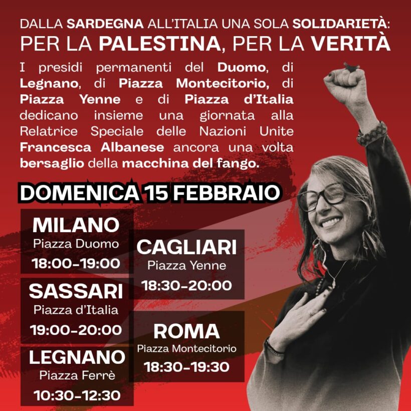 “Il Presidio di Domani Domenica 15 Febbraio è dedicato a FRANCESCA ALBANESE chiamata a subire un ulteriore difficile momento, nel quale il suo immenso lavoro è deliberatamente intralciato dalle manipolazioni del sistema di potere, volte a stroncarle ogni vigore e voce.