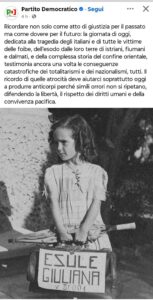Il 10 febbraio, in memoria di “Martiri della Foibe”, il Partito Democratico – sulla sua pagina Facebook – ha scritto: