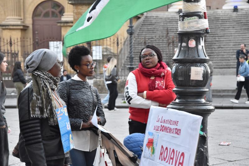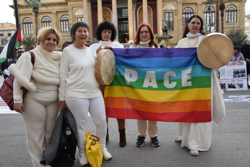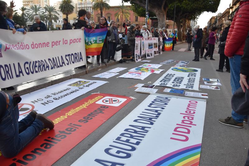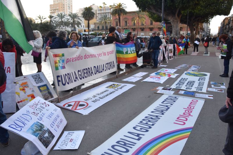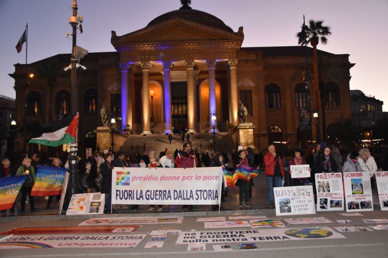 “Fuori la guerra dalla Storia” recita lo striscione che le accompagna da quattro anni e accanto, sulla strada pedonale di fronte al Teatro Massimo, si aggiungono cartelli che questa storia raccontano in tutti i paesi dove la guerra non tace. Ucraina e Palestina, Iran e Afghanistan, Congo e Sudan, Myanmar e Siria.
