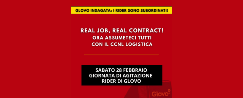 Per questo lanciamo per sabato 28 febbraio una giornata di agitazione dei rider di Glovo. Per trasformare questa inchiesta giudiziaria in una conquista concreta. Per fare pressione insieme, collettivamente, affinché venga riconosciuta la natura subordinata del nostro lavoro e si proceda all’assunzione diretta di tutti con l’applicazione integrale del CCNL Logistica.