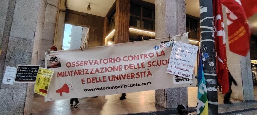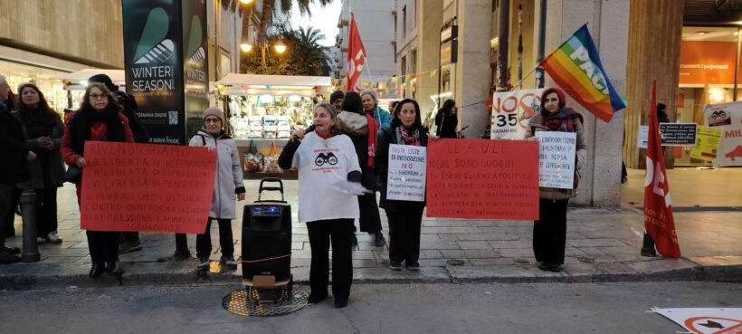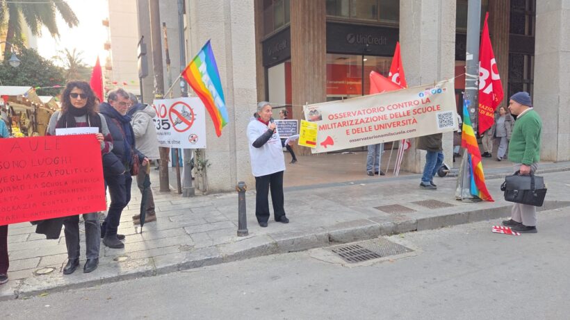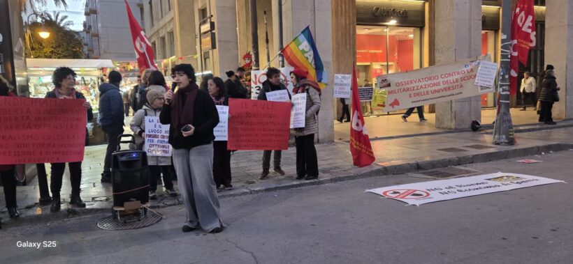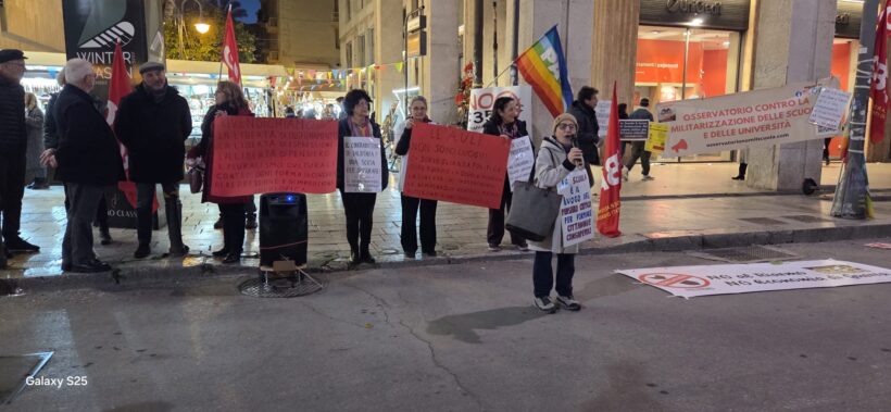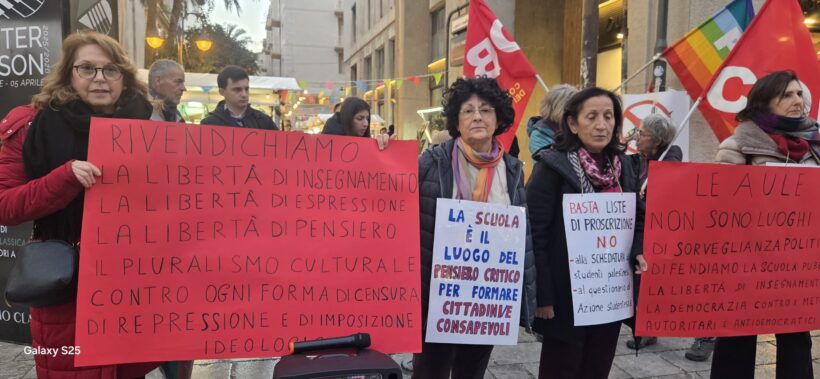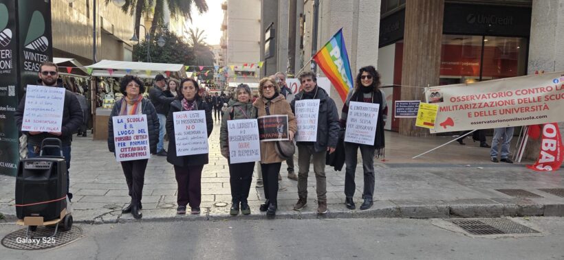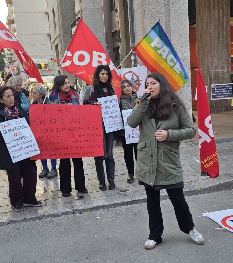 Tre generazioni in sintonia oggi pomeriggio al presidio di Palermo per la libertà d’insegnamento, che ha chiuso la settimana di controinformazione nelle scuole voluta dai Cobas e dall’Osservatorio contro la militarizzazione: studenti (USB, Antudo, Cambiare Rotta, Collettivo Scirocco), giovani docenti e docenti anziani (Assemblea No Guerra, No Muos, Laboratorio Ballarò e naturalmente Cobas Scuola).